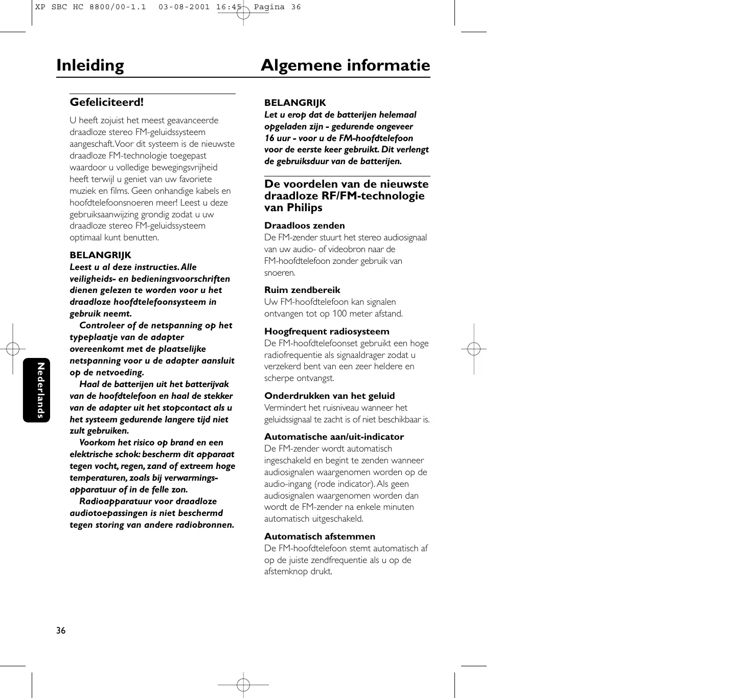 03-08-2001 16:45 Inleiding Gefeliciteerd! U heeft zojuist het meest geavanceerde draadloze stereo FM-geluidssysteem aangeschaft.Voor dit systeem is de nieuwste draadloze FM-technologie toegepast waardoor u volledige bewegingsvrijheid heeft terwijl u geniet van uw favoriete muziek en films. Geen onhandige kabels en hoofdtelefoonsnoeren meer! Leest u deze gebruiksaanwijzing grondig zodat u uw draadloze stereo FM-geluidssysteem optimaal kunt benutten. Nederlands BELANGRIJK Leest u al deze instructies.Alle veiligheids- en bedieningsvoorschriften dienen gelezen te worden voor u het draadloze hoofdtelefoonsysteem in gebruik neemt. Controleer of de netspanning op het typeplaatje van de adapter overeenkomt met de plaatselijke netspanning voor u de adapter aansluit op de netvoeding. Haal de batterijen uit het batterijvak van de hoofdtelefoon en haal de stekker van de adapter uit het stopcontact als u het systeem gedurende langere tijd niet zult gebruiken. Voorkom het risico op brand en een elektrische schok: bescherm dit apparaat tegen vocht, regen, zand of extreem hoge temperaturen, zoals bij verwarmingsapparatuur of in de felle zon. Radioapparatuur voor draadloze audiotoepassingen is niet beschermd tegen storing van andere radiobronnen. Pagina 36 Algemene informatie BELANGRIJK Let u erop dat de batterijen helemaal opgeladen zijn - gedurende ongeveer 16 uur - voor u de FM-hoofdtelefoon voor de eerste keer gebruikt. Dit verlengt de gebruiksduur van de batterijen. De voordelen van de nieuwste draadloze RF/FM-technologie van Philips Draadloos zenden De FM-zender stuurt het stereo audiosignaal van uw audio- of videobron naar de FM-hoofdtelefoon zonder gebruik van snoeren. Ruim zendbereik Uw FM-hoofdtelefoon kan signalen ontvangen tot op 100 meter afstand. Hoogfrequent radiosysteem De FM-hoofdtelefoonset gebruikt een hoge radiofrequentie als signaaldrager zodat u verzekerd bent van een zeer heldere en scherpe ontvangst. Onderdrukken van het geluid Vermindert het ruisniveau wanneer het geluidssignaal te zacht is of niet beschikbaar is. Automatische aan/uit-indicator De FM-zender wordt automatisch ingeschakeld en begint te zenden wanneer audiosignalen waargenomen worden op de audio-ingang (rode indicator). Als geen audiosignalen waargenomen worden dan wordt de FM-zender na enkele minuten automatisch uitgeschakeld. Automatisch afstemmen De FM-hoofdtelefoon stemt automatisch af op de juiste zendfrequentie als u op de afstemknop drukt.