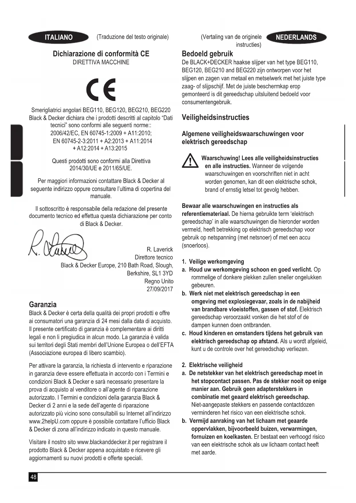 BEG110, BEG120, BEG210, BEG220 Haakse Slijpers Black & Decker verklaart dat deze producten, die worden beschreven onder ‘Technische gegevens’, voldoen aan: 2006/42/EC, EN 60745-1:2009 + A11:2010; EN 60745-2-3:2011 + A2:2013 + A11:2014 + A12:2014 + A13:2015 Deze producten voldoen tevens aan richtlijn 2014/30/EU en 2011/65/EU. Neem voor meer informatie contact op met Black & Decker op het volgende adres of raadpleeg de achterzijde van de handleiding. Ondergetekende is verantwoordelijk voor de samenstelling van het technische bestand en legt deze verklaring af namens Black & Decker. R. Laverick Director of Engineering Black & Decker Europe, 210 Bath Road, Slough, Berkshire, SL1 3YD Verenigd Koninkrijk 27-9-2017 Garantie Black & Decker heeft vertrouwen in zijn producten en biedt consumenten een garantie van 24 maanden vanaf de aankoopdatum. Deze garantie vormt een aanvulling op uw wettelijke rechten en beperken deze niet. De garantie is geldig op het grondgebied van de Lidstaten van de Europese Unie en de Europese Vrijhandelszone. Voor een garantie-aanspraak moet uw aanspraak in overeenstemming zijn met de Voorwaarden en Condities van Black & Decker en moet u een bewijs van aankoop overleggen aan de verkoper of aan een geautoriseerde reparatiemonteur. Voorwaarden en condities van de 2-jarige garantie van Black & Decker en het adres van de vestiging van het geautoriseerde reparatiecentrum bij u in de buurt, kunt L60 (Vertaling van de originele instructies) NEDERLANDS Uso previsto Las amoladoras angulares BEG110, BEG120, BEG210 y BEG220 de BLACK+DECKER han sido diseñadas para el amolado y el corte de metales y mampostería usando el tipo de disco de corte o amolado apropiado. Cuando se coloca el protector correspondiente, estas herramientas están destinadas solo al uso doméstico. Instrucciones de seguridad Advertencias de seguridad generales para herramientas eléctricas