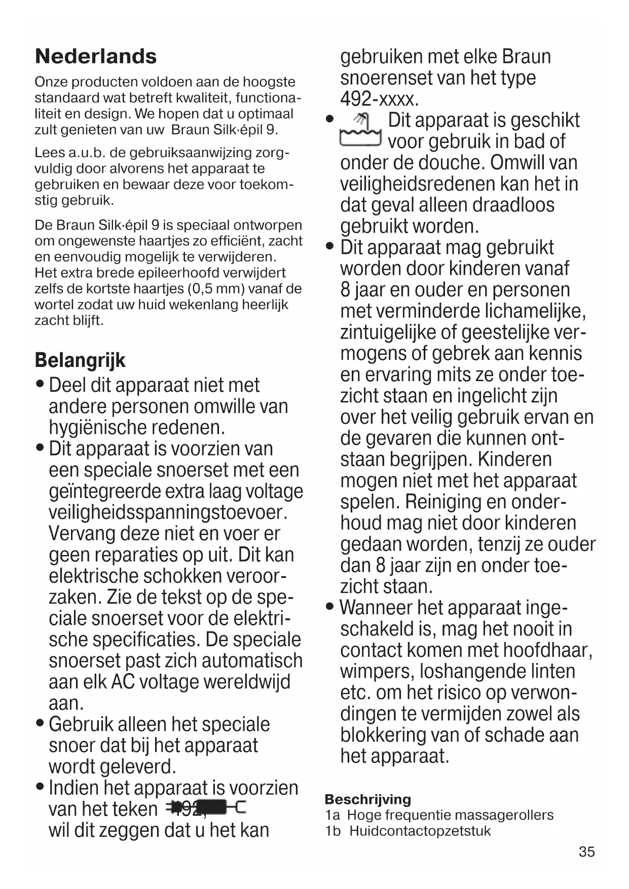 Indien het apparaat is voorzien van het teken 492, wil dit zeggen dat u het kan gebruiken met elke Braun snoerenset van het type 492-xxxx.