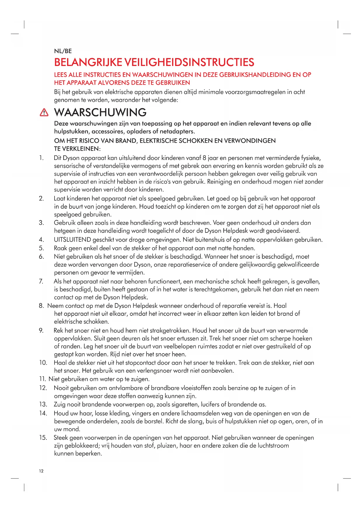 - Voer geen onderhoud of reparatiewerk uit anders dan hetgeen in uw Dyson-gebruikershandleiding wordt toegelicht of door de Dyson Helpline wordt geadviseerd.