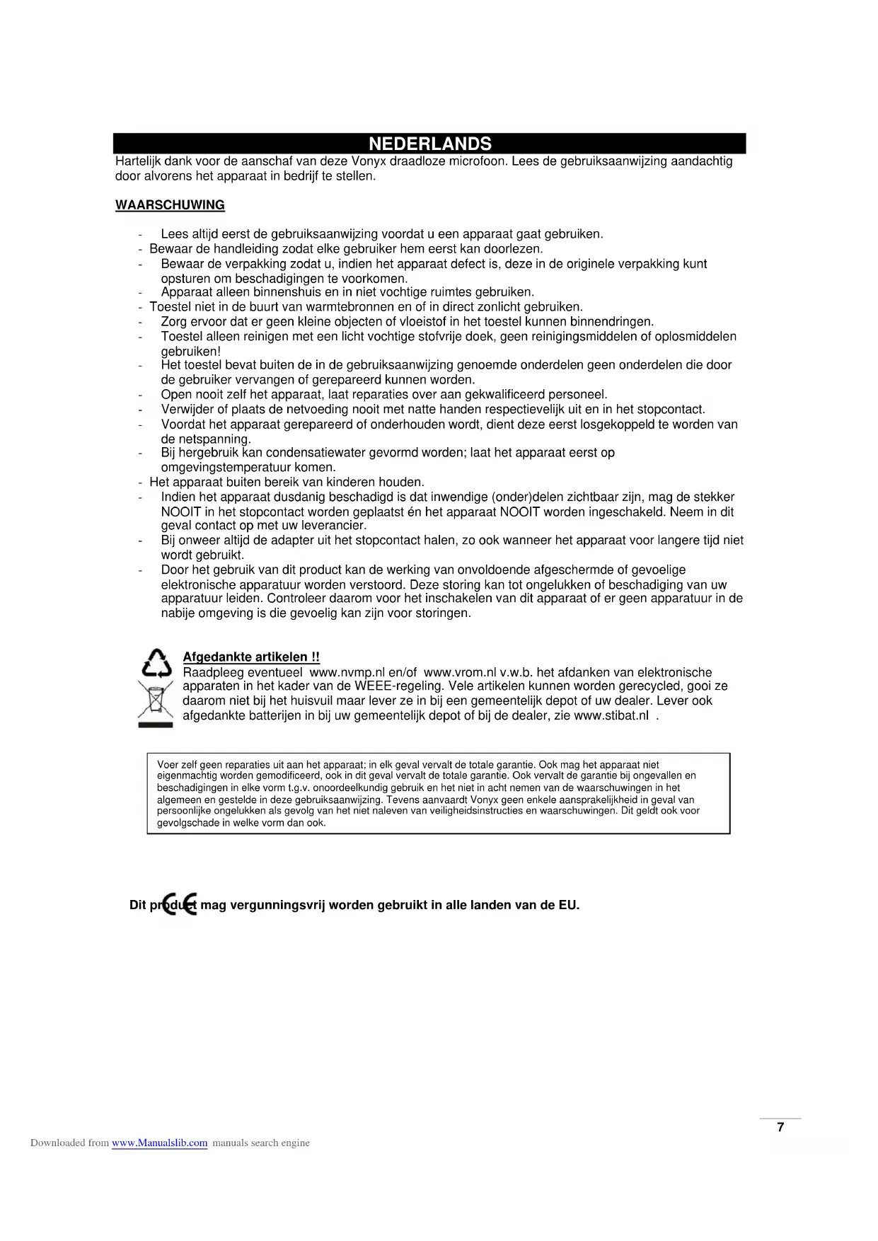 Afgedankte artikelen !! Raadpleeg eventueel www.nvmp.nl en/of www.vrom.nl v.w.b. het afdanken van elektronische apparaten in het kader van de WEEE-regeling. Vele artikelen kunnen worden gerecycled, gooi ze daarom niet bij het huisvuil maar lever ze in bij een gemeentelijk depot of uw dealer. Lever ook afgedankte batterijen in bij uw gemeentelijk depot of bij de dealer, zie www.stibat.nl .