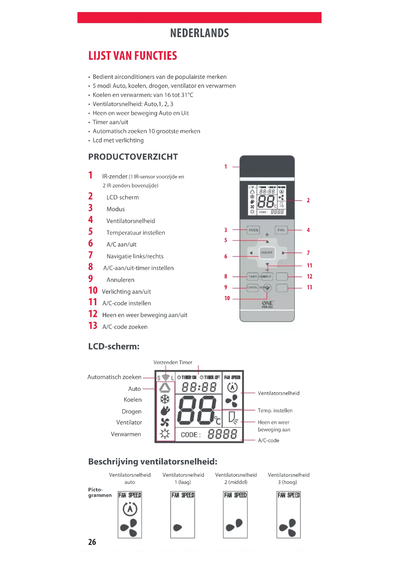 Ventilatorsnelheid auto Ventilatorsnelheid1 (laag)Ventilatorsnelheid2 (middel)Ventilatorsnelheid3 (hoog)27 NEDERLANDS De One For All afstandsbediening voor airconditioners is een universele vervangende afstandsbediening voor de meeste merken airconditioners. Met deze afstandsbediening kunt u de modus, ventilatorsnelheid en heen en weer beweging instellen. Voordat u de afstandsbediening kunt gebruiken, moet u deze instellen met een 4-cijferige code
