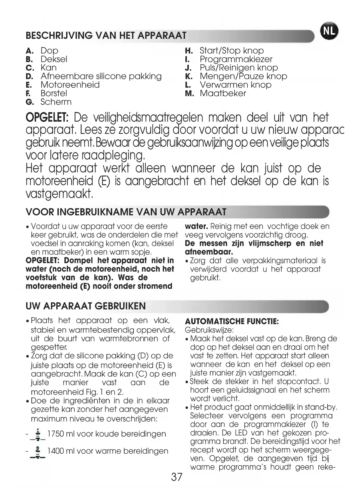 - Voordat u uw apparaat voor de eerstekeer gebruikt, was de onderdelen die metvoedsel in aanraking komen (kan, dekselen maatbeker) in een warm sopje.OPGELET: Dompel het apparaat niet inwater (noch de motoreenheid, noch hetvoetstuk van de kan). Was demotoreenheid (E) nooit onder stromendwater. Reinig met een vochtige doek enveeg vervolgens voorzichtig droog.De messen zijn vlijmscherp en nietafneembaar.• Zorg dat alle verpakkingsmateriaal isverwijderd voordat u het apparaatgebruikt. OPGELET: De veiligheidsmaatregelen maken deel uit van het apparaat. Lees ze zorgvuldig door voordat u uw nieuw apparaat in gebruik neemt. Bewaar de gebruiksaanwijzing op een veilige plaats voor latere raadpleging. Het apparaat werkt alleen wanneer de kan juist op de motoreenheid (E) is aangebracht en het deksel op de kan is vastgemaakt.