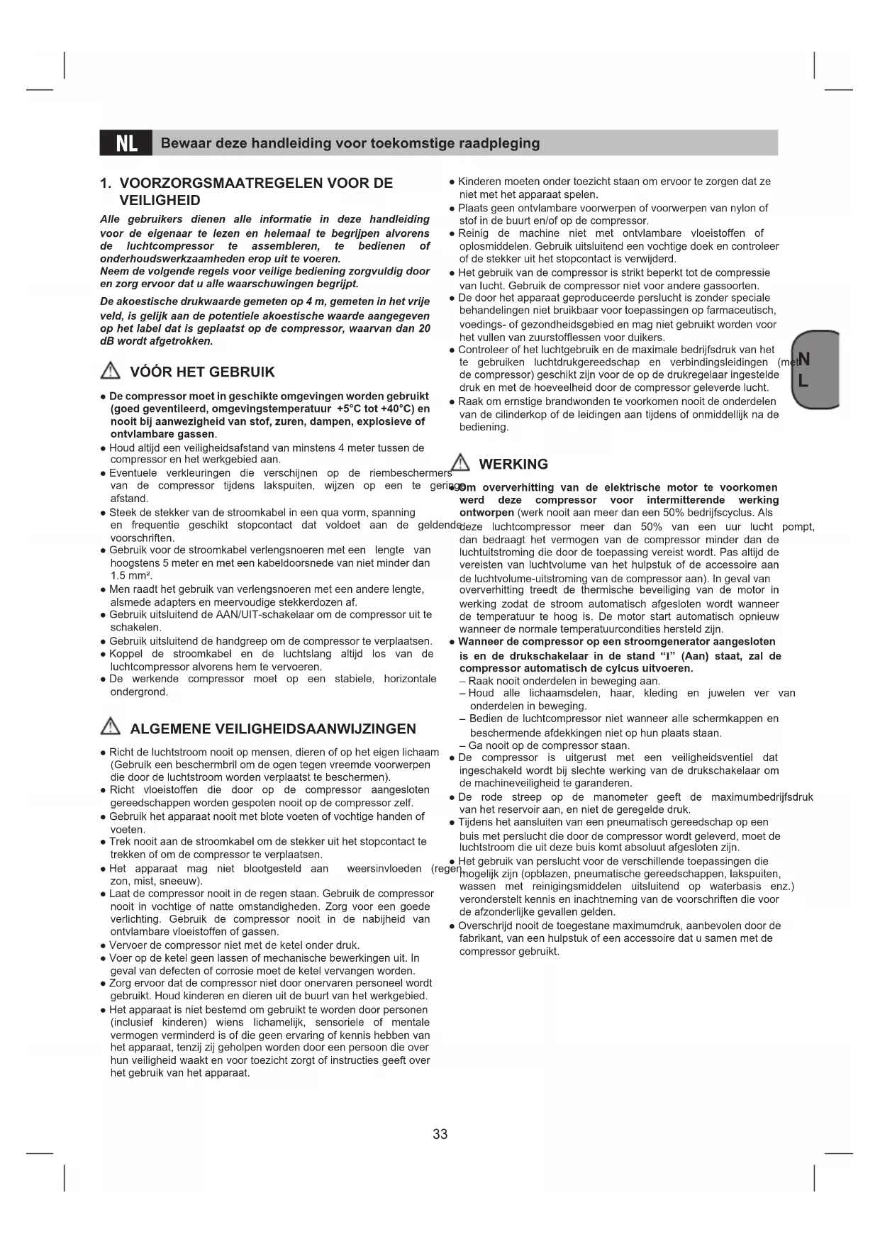 VEILIGHEID Alle gebruikers dienen alle informatie in deze handleiding voor de eigenaar te lezen en helemaal te begrijpen alvorens de luchtcompressor te assembleren, te bedienen of onderhoudswerkzaamheden erop uit te voeren. Neem de volgende regels voor veilige bediening zorgvuldig door en zorg ervoor dat u alle waarschuwingen begrijpt. De akoestische drukwaarde gemeten op 4 m, gemeten in het vrije veld, is gelijk aan de potentiele akoestische waarde aangegeven op het label dat is geplaatst op de compressor, waarvan dan 20 dB wordt afgetrokken.