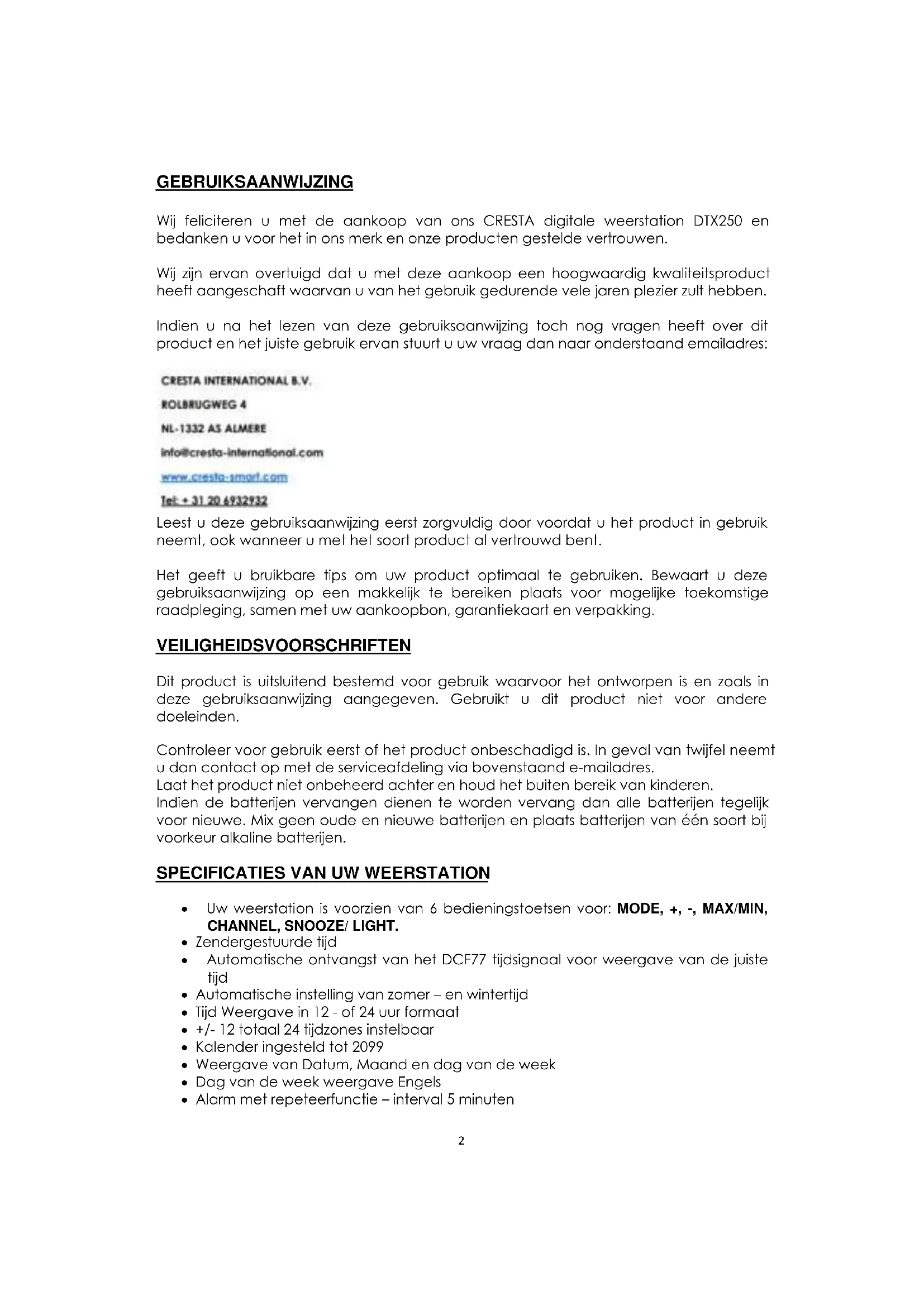 Wij feliciteren u met de aankoop van ons CRESTA digitale weerstation DTX250 en bedanken u voor het in ons merk en onze producten gestelde vertrouwen.