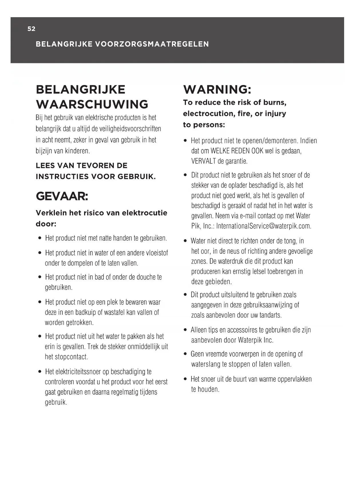 - Dit product niet te gebruiken als het snoer of de stekker van de oplader beschadigd is, als het product niet goed werkt, als het is gevallen of beschadigd is geraakt of nadat het in het water is gevallen. Neem via e-mail contact op met Water Pik, Inc.: InternationalService@waterpik.com.