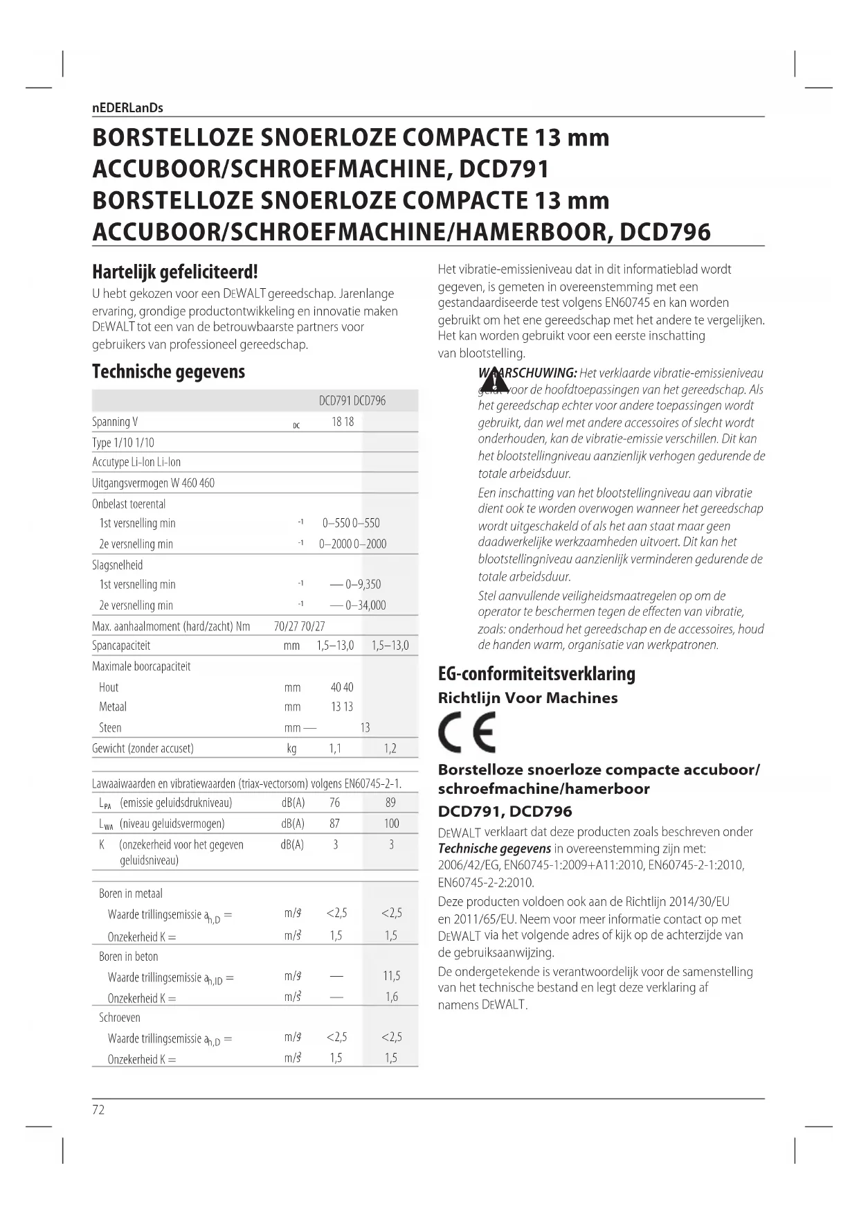 DEWALT verkaart dat deze producten zoals beschreiben onder Technische gegevens in overeenstemming zich met: 2006/42/EG, EN60745-1:2009+A11:2010, EN60745-2-1:2010, EN60745-2-2:2010.