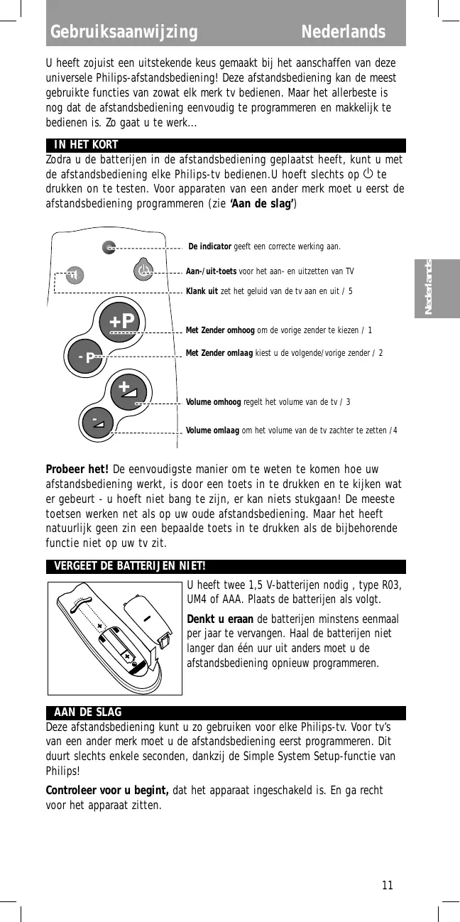 RU455- page 11 Gebruiksaanwijzing Nederlands U heeft zojuist een uitstekende keus gemaakt bij het aanschaffen van deze universele Philips-afstandsbediening! Deze afstandsbediening kan de meest gebruikte functies van zowat elk merk tv bedienen. Maar het allerbeste is nog dat de afstandsbediening eenvoudig te programmeren en makkelijk te bedienen is. Zo gaat u te werk...