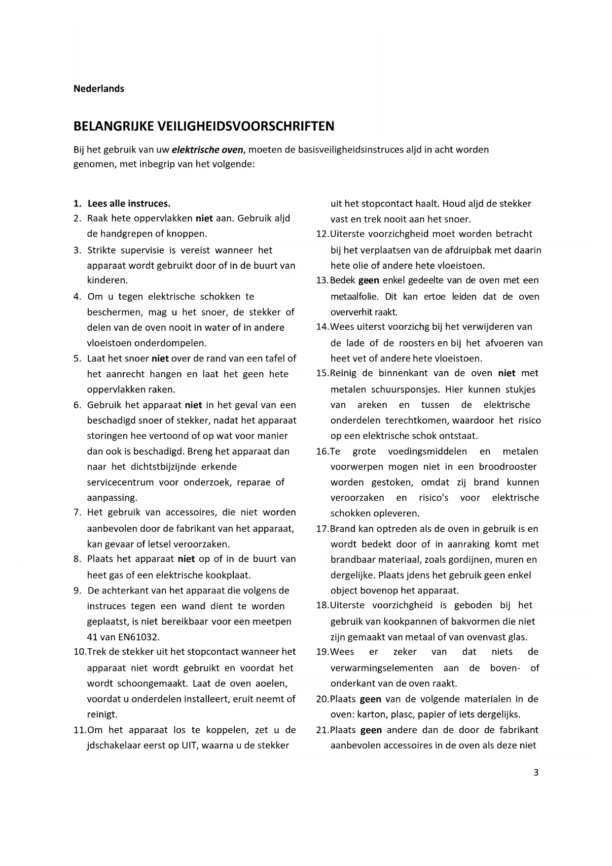 Waarschuwing: Zorg ervoor dat de stekker uit het stopcontact is en laat de oven afkoelen, voordat u hem schoonmaakt. De oven is voorzien van een reinigingslaag die zichzelf tijdens normaal gebruik automatisch reinigt. Eventuele spatten die tijdens het koken in contact komen met deze reinigingslaag worden geoxideerd, terwijl de oven in bedrijf is. Indien gewenst, reinig de wanden met een vochtige spons, doek of nylon schuursponsje en een mild schoonmaakmiddel. Gebruik GEEN schuursponsjes van staalwol of schurende schoonmaakmiddelen. Schraap de wanden niet af met gereedschap van metaal. Al deze middelen kunnen de reinigingslaag beschadigen. Alle accessoires moeten in heet water en zeep worden gewassen of moeten worden gereinigd in een vaatwasser. De deur kan worden schoongemaakt met een vochtige spons en drooggemaakt met een papieren of stoffen handdoek. Reinig de buitenkant met een vochtige spons. Gebruik GEEN schurende schoonmaakmiddelen, omdat deze de afwerking van de buitenkant kunnen beschadigen. Gebruik GEEN schurende schoonmaakmiddelen of een schuurspons van staalwol voor het reinigen van de lekbak, omdat het de geëmailleerde afwerking kan aantasten. Laat alle onderdelen en oppervlakken goed drogen, voordat u de oven weer aansluit op het stopcontact en in gebruik neemt. Oude elektrische en elektronische apparaten bevatten vaak nog waardevolle materialen. Ze bevatten echter ook schadelijke stoffen die noodzakelijk waren voor hun functionaliteit en veiligheid. Als deze bij het niet-recyclebaar afval worden geplaatst of onjuist worden verwijderd, dan kunnen ze schadelijk zijn voor de menselijke gezondheid en het milieu. Zet uw apparaat daarom nooit bij het niet-recyclebaar afval.12 SPECIALE WAARSCHUWINGEN
