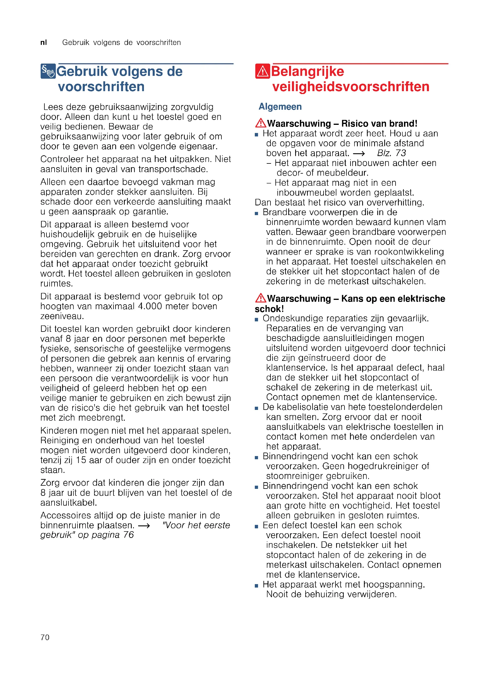 8Gebruik volgens de voorschriften Gebr ui k vol gens de voor schr i f t en Lees deze gebruiksaanwijzing zorgvuldig door. Alleen dan kunt u het toestel goed en veilig bedienen. Bewaar de gebruiksaanwijzing voor later gebruik of om door te geven aan een volgende eigenaar. Controleer het apparaat na het uitpakken. Niet aansluiten in geval van transportschade. Alleen een daartoe bevoegd vakman mag apparaten zonder stekker aansluiten. Bij schade door een verkeerde aansluiting maakt u geen aanspraak op garantie. Dit apparaat is alleen bestemd voor huishoudelijk gebruik en de huiselijke omgeving. Gebruik het uitsluitend voor het bereiden van gerechten en drank. Zorg ervoor dat het apparaat onder toezicht gebruikt wordt. Het toestel alleen gebruiken in gesloten ruimtes. Dit apparaat is bestemd voor gebruik tot op hoogten van maximaal 4.000 meter boven zeeniveau. Dit toestel kan worden gebruikt door kinderen vanaf 8 jaar en door personen met beperkte fysieke, sensorische of geestelijke vermogens of personen die gebrek aan kennis of ervaring hebben, wanneer zij onder toezicht staan van een persoon die verantwoordelijk is voor hun veiligheid of geleerd hebben het op een veilige manier te gebruiken en zich bewust zijn van de risico's die het gebruik van het toestel met zich meebrengt. Kinderen mogen niet met het apparaat spelen. Reiniging en onderhoud van het toestel mogen niet worden uitgevoerd door kinderen, tenzij zij 15 aar of ouder zijn en onder toezicht staan. Zorg ervoor dat kinderen die jonger zijn dan 8 jaar uit de buurt blijven van het toestel of de aansluitkabel. Accessoires altijd op de juiste manier in de binnenruimte plaatsen. ~ "Voor het eerste gebruik" op pagina 76 (Belangrijke veiligheidsvoorschriften Bel angr i j ke veiligheidsvoorschriften Algemeen :Waarschuwing – Risico van brand! ■ Het apparaat wordt zeer heet. Houd u aan de opgaven voor de minimale afstand boven het apparaat. ~ Blz. 73 – Het apparaat niet inbouwen achter een decor- of meubeldeur. – Het apparaat mag niet in een inbouwmeubel worden geplaatst. Dan bestaat het risico van oververhitting. Risico van brand! ■ Brandbare voorwerpen die in de binnenruimte worden bewaard kunnen vlam vatten. Bewaar geen brandbare voorwerpen in de binnenruimte. Open nooit de deur wanneer er sprake is van rookontwikkeling in het apparaat. Het toestel uitschakelen en de stekker uit het stopcontact halen of de zekering in de meterkast uitschakelen. :Waarschuwing – Kans op een elektrische schok! ■ Ondeskundige reparaties zijn gevaarlijk. Reparaties en de vervanging van beschadigde aansluitleidingen mogen uitsluitend worden uitgevoerd door technici die zijn geïnstrueerd door de klantenservice. Is het apparaat defect, haal dan de stekker uit het stopcontact of schakel de zekering in de meterkast uit. Contact opnemen met de klantenservice. Kans op een elektrische schok! ■ De kabelisolatie van hete toestelonderdelen kan smelten. Zorg ervoor dat er nooit aansluitkabels van elektrische toestellen in contact komen met hete onderdelen van het apparaat. Kans op een elektrische schok! ■ Binnendringend vocht kan een schok veroorzaken. Geen hogedrukreiniger of stoomreiniger gebruiken. Kans op een elektrische schok! ■ Binnendringend vocht kan een schok veroorzaken. Stel het apparaat nooit bloot aan grote hitte en vochtigheid. Het toestel alleen gebruiken in gesloten ruimtes. Kans op een elektrische schok! ■ Een defect toestel kan een schok veroorzaken. Een defect toestel nooit inschakelen. De netstekker uit het stopcontact halen of de zekering in de meterkast uitschakelen. Contact opnemen met de klantenservice. Kans op een elektrische schok! ■ Het apparaat werkt met hoogspanning. Nooit de behuizing verwijderen. Gevaar voor een elektrische schok!Belangrijke veiligheidsvoorschriften nl