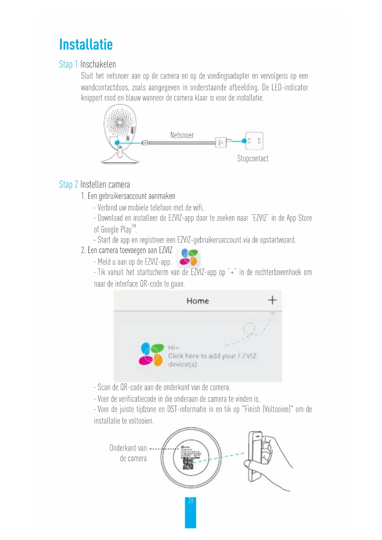 Si consiglia di utilizzare l'alimentatore standard EZVIZ per assicurare una tensione di alimentazione stabile. Per ulteriori informazioni, visitare www.ezvizlife.com.26 Installatie Stap 1 Inschakelen Sluit het netsnoer aan op de camera en op de voedingsadapter en vervolgens op een wandcontactdoos, zoals aangegeven in onderstaande afbeelding. De LED-indicator knippert rood en blauw wanneer de camera klaar is voor de installatie. Netsnoer Stopcontact Stap 2 Instellen camera