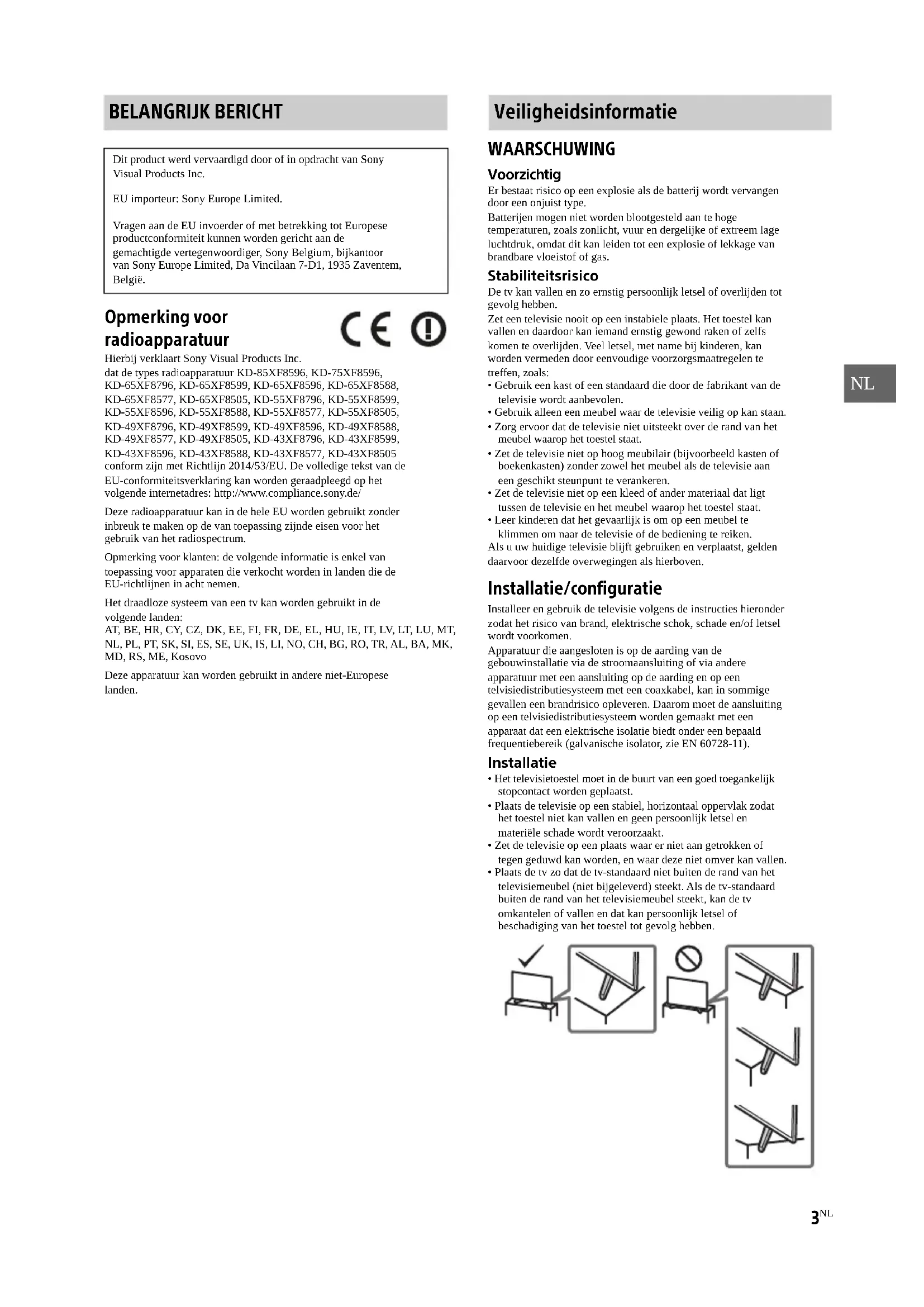 BELANGRIJK BERICHT Opmerking voor radioapparatuur Hierbij verklaart Sony Visual Products Inc. dat de types radioapparatuur KD-85XF8596, KD-75XF8596, KD-65XF8796, KD-65XF8599, KD-65XF8596, KD-65XF8588, KD-65XF8577, KD-65XF8505, KD-55XF8796, KD-55XF8599, KD-55XF8596, KD-55XF8588, KD-55XF8577, KD-55XF8505, KD-49XF8796, KD-49XF8599, KD-49XF8596, KD-49XF8588, KD-49XF8577, KD-49XF8505, KD-43XF8796, KD-43XF8599, KD-43XF8596, KD-43XF8588, KD-43XF8577, KD-43XF8505 conform zijn met Richtlijn 2014/53/EU. De volledige tekst van de EU-conformiteitsverklaring kan worden geraadpleegd op het volgende internetadres: http://www.compliance.sony.de/ Deze radioapparatuur kan in de hele EU worden gebruikt zonder inbreuk te maken op de van toepassing zijnde eisen voor het gebruik van het radiospectrum. Opmerking voor klanten: de volgende informatie is enkel van toepassing voor apparaten die verkocht worden in landen die de EU-richtlijnen in acht nemen. Het draadloze systeem van een tv kan worden gebruikt in de volgende landen: AT, BE, HR, CY, CZ, DK, EE, FI, FR, DE, EL, HU, IE, IT, LV, LT, LU, MT, NL, PL, PT, SK, SI, ES, SE, UK, IS, LI, NO, CH, BG, RO, TR, AL, BA, MK, MD, RS, ME, Kosovo Deze apparatuur kan worden gebruikt in andere niet-Europese landen. Veiligheidsinformatie WAARSCHUWING Voorzichtig Er bestaat risico op een explosie als de batterij wordt vervangen door een onjuist type. Batterijen mogen niet worden blootgesteld aan te hoge temperaturen, zoals zonlicht, vuur en dergelijke of extreem lage luchtdruk, omdat dit kan leiden tot een explosie of lekkage van brandbare vloeistof of gas. Stabiliteitsrisico De tv kan vallen en zo ernstig persoonlijk letsel of overlijden tot gevolg hebben. Zet een televisie nooit op een instabiele plaats. Het toestel kan vallen en daardoor kan iemand ernstig gewond raken of zelfs komen te overlijden. Veel letsel, met name bij kinderen, kan worden vermeden door eenvoudige voorzorgsmaatregelen te treffen, zoals: