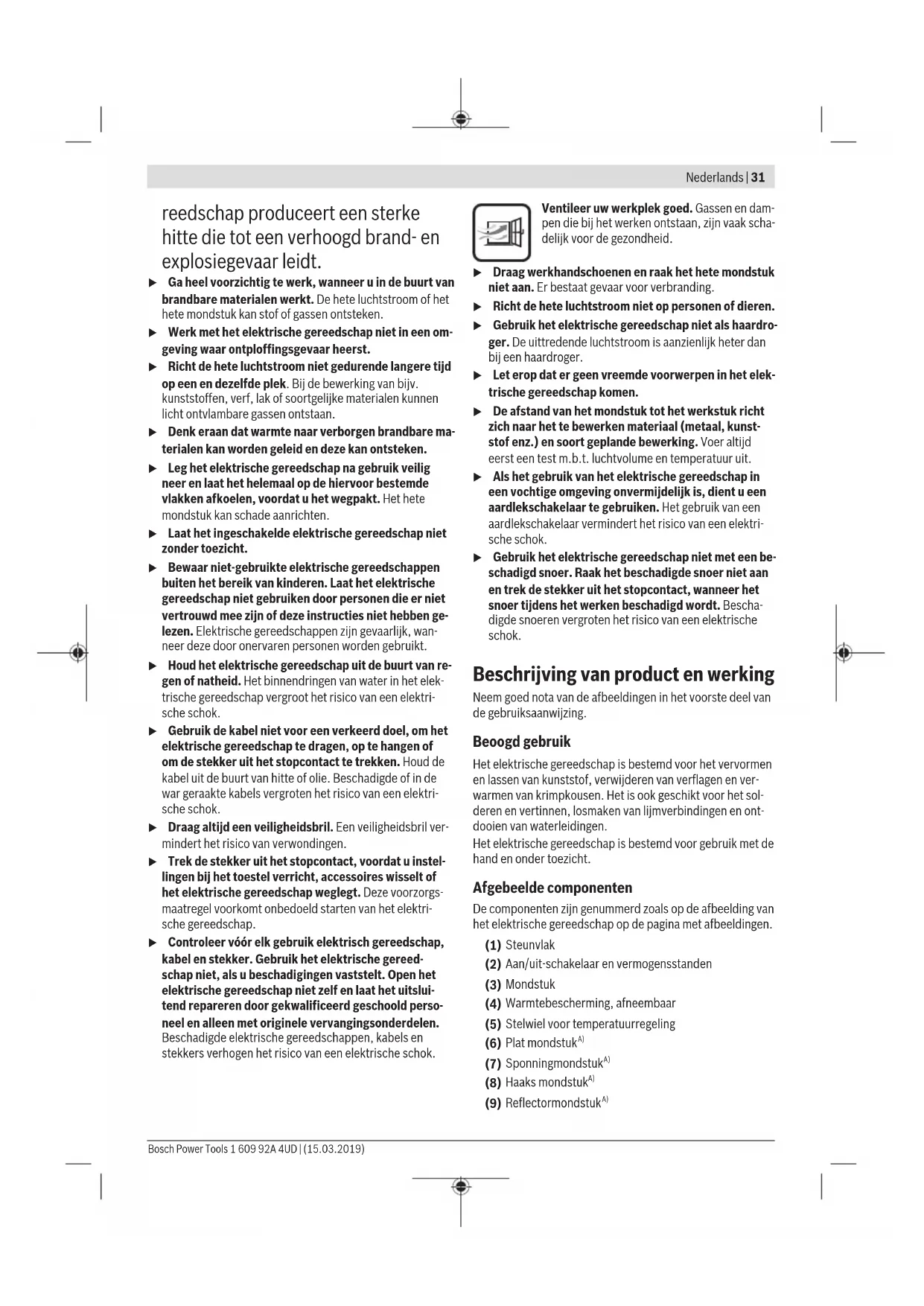 Gebruik Ingebruikname u Let op de netspanning! De spanning van de stroombron moet overeenkomen met de gegevens op het typeplaatje van het elektrische gereedschap. Rookontwikkeling bij de eerste ingebruikname In de fabriek zijn de metalen oppervlakken met een coating tegen corrosie beschermd. Deze beschermlaag verdampt bij de eerste ingebruikname. Inschakelen Schuif de aan/uit-schakelaar(2) omhoog. Uitschakelen Schuif de aan/uit-schakelaar(2) omlaag in stand0. u Laat het elektrische gereedschap na langere tijd wer- ken met een hoge temperatuur vóór het uitschakelen afkoelen. Laat het daarvoor korte tijd met de laagste instelbare temperatuur lopen. Luchtvolume regelen Met de aan/uit-schakelaar(2) kunt u het luchtvolume in ver- schillende standen regelen: Luchtvolumestand l/min °C 150–300 50–630 300–500 50–630 Verminder het luchtvolume bijvoorbeeld, wanneer de omge- ving van een werkstuk niet overmatig verhit mag worden of wanneer een licht werkstuk door de luchtstroom verplaatst zou kunnen worden. Temperatuur regelen Met het stelwiel(5) kunt u de temperatuur van de lucht- stroom regelen. De gemarkeerde standen van het stelwiel komen overeen met de volgende temperatuurbereiken: Stand van het stelwiel Temperatuur in °C 1 50–80 2 130–160 3 210–240 4 280–310 5 340–370 6 410–440 7 480–510 8 550–580 9 620–630 Stelwielstand 1 is geschikt voor het afkoelen van een verhit werkstuk of het drogen van verf. Deze is eveneens geschikt om het elektrische gereedschap vóór het wegzetten of wis- selen van de opzetmondstukken af te koelen. Aanwijzingen voor werkzaamheden u Trek vóór werkzaamheden aan het elektrische gereed- schap altijd de stekker uit het stopcontact. Aanwijzing: Breng het mondstuk(3) niet te dicht bij het te bewerken werkstuk. De ophoping van warme lucht kan tot oververhitting van het elektrische gereedschap leiden. Warmtebescherming verwijderen Voor werken op zeer krappe plekken kunt u de warmtebe- scherming(4) door te draaien verwijderen. u Voorzichtig met het hete mondstuk! Bij werkzaamhe- den zonder warmtebescherming bestaat een verhoogd verbrandingsgevaar. Voor het verwijderen of aanbrengen van de warmtebescher- ming(4) schakelt u het elektrische gereedschap uit en laat het afkoelen. Als u het elektrische gereedschap sneller wilt laten afkoelen, kunt u het ook kort met de laagst instelbare temperatuur la- ten lopen. 1 609 92A 4UD | (15.03.2019) Bosch Power ToolsNederlands | 33 Elektrisch gereedschap neerzetten Zet het elektrische gereedschap op de steunvlakken(1) neer om het te laten afkoelen of om beide handen voor het werken vrij te hebben. u Werk zeer voorzichtig met het neergezette elektri- sche gereedschap! U kunt zich aan het hete mondstuk of aan de hete luchtstroom verbranden. Plaats het elektrische gereedschap op een vlakke, stabiele ondergrond. Zorg ervoor dat het niet kan omvallen. Zet de kabel buiten uw werkbereik vast, zodat deze het elektrische gereedschap niet kan omgooien of omlaag trekken. Schakel het elektrische gereedschap uit, wanneer dit lange- re tijd niet wordt gebruikt, en trek de stekker uit het stopcon- tact. Gebruiksvoorbeelden (zieafbeeldingenA–G) De afbeeldingen van de gebruiksvoorbeelden vindt u op de pagina's met afbeeldingen. De afstand van het mondstuk tot het werkstuk richt zich naar het te bewerken materiaal (metaal, kunststof enz.) en soort geplande bewerking. De optimale temperatuur voor de desbetreffende toepassing kan door praktische proeven worden bepaald. Voer altijd eerst een test m.b.t. luchtvolume en temperatuur uit. Begin met een grotere afstand en een lage vermogens- stand. Pas afstand en vermogensstand vervolgens naar be- hoefte aan. Wanneer u er niet zeker van bent welk materiaal u bewerkt of hoe de werking van de hete lucht op het materiaal is, test dan de werking op een onzichtbare plek. U kunt bij alle gebruiksvoorbeelden behalve „Lak van raam- kozijnen verwijderen“ zonder accessoire werken. Het ge- bruik van het voorgestelde accessoire vereenvoudigt echter de werkzaamheden en verhoogt de kwaliteit van het resul- taat in belangrijke mate. u Voorzichtig bij het wisselen van het mondstuk! Raak het hete mondstuk niet aan. Laat het elektrische ge- reedschap afkoelen en draag werkhandschoenen bij het wisselen. U kunt zich aan het hete mondstuk ver- branden. Als u het elektrische gereedschap sneller wilt laten afkoelen, kunt u het ook kort met de laagst instelbare temperatuur la- ten lopen. Lak verwijderen en lijm losmaken (zieafbeeldingA) Zet het platte mondstuk(6) (accessoire) erop. Maak de lak even zacht met hete lucht en verwijder deze met een schoon plamuurmes. Lange inwerking van hitte verbrandt de lak en maakt het verwijderen lastiger. Veel plakmiddelen worden door warmte zacht. Bij verwarm- de lijm kunt u verbindingen losmaken of overtollige lijm ver- wijderen. Lak van raamkozijnen verwijderen (zieafbeeldingB) u Gebruik absoluut het sponningmondstuk (7) (acces- soire). Er bestaat gevaar voor glasbreuk. Van geribbelde vlakken kunt u de lak met een geschikt pla- muurmes verwijderen en vervolgens met een zachte draad- borstel wegborstelen. Waterleidingen ontdooien (zieafbeeldingC) u Controleer vóór het verwarmen of het daadwerkelijk om een waterleiding gaat. Waterleidingen zijn vaak aan hun uiterlijk niet van gasleidingen te onderscheiden. Gas- leidingen mogen in geen geval worden verwarmd. Zet het haakse mondstuk(8) (accessoire) erop. Verwarm bevroren plekken bij voorkeur van de afvoer naar de toevoer toe. Verwarm kunststof buizen en verbindingen tussen buisstuk- ken bijzonder voorzichtig om beschadigingen te voorkomen. Kunststof buizen vervormen (zieafbeeldingD) Zet het reflectormondstuk(9) (accessoire) erop. Vul kunst- stof buizen met zand en sluit deze aan beide kanten af om knikken van de buis te verhinderen. Verwarm de buis voor- zichtig en gelijkmatig door zijwaarts heen-en-weer te bewe- gen. Kunststof lassen (zieafbeeldingE) Breng het reduceermondstuk(12) en het lasmondstuk(11) (beide acc