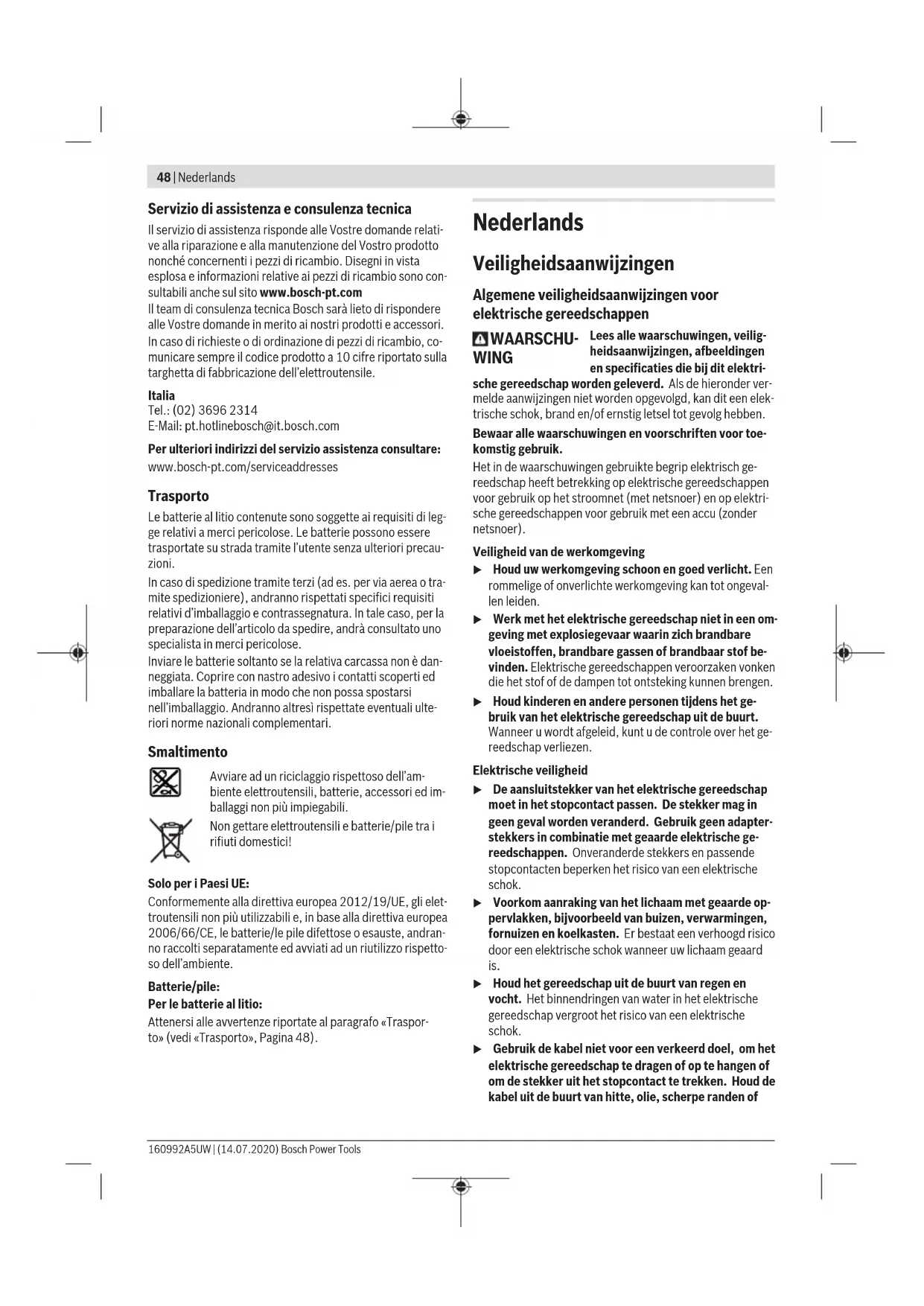 tot =0,12). A scopo di controllo, la coppia di serraggio andrà sempre verificata con una chiave torsiometrica. Classi di durezza secondo DIN267 Viti standard Viti ad alta resistenza 3,6 4,6 5,6 4,8 6,6 5,8 6,8 6,9 8,8 10,9 12,9 M6 2,71 3,61 4,52 4,8 5,42 6,02 7,22 8,13 9,7 13,6 16,2 M8 6,57 8,7 11 11,6 13,1 14,6 17,5 19,7 23 33 39 M10 13 17,5 22 23 26 29 35 39 47 65 78 M12 22,6 30 37,6 40 45 50 60 67 80 113 135 M14 36 48 60 65 72 79 95 107 130 180 215 M16 55 73 92 98 110 122 147 165 196 275 330 Suggerimenti Prima d’inserire viti lunghe e voluminose in materiali duri, andrà eseguito un preforo per circa 2/3 della lunghezza di avvitamento, mediante il diametro del nucleo del filetto. Avvertenza: Accertarsi che nessun pezzo di piccole dimen- sioni penetri nell’elettroutensile. Dopo un impiego prolungato a velocità ridotta, lasciar raf- freddare l’elettroutensile, facendolo funzionare a vuoto a ve- locità massima per circa 3 minuti. Clip di aggancio cintura Tramite la clip di aggancio cintura (5) è possibile ad esempio agganciare l’elettroutensile ad una cinghia. In questo modo si hanno libere entrambe le mani e l’elettroutensile è sempre a portata di mano. Avvertenze per l’impiego ottimale della batteria Proteggere la batteria dall’umidità e dall’acqua. Conservare la batteria esclusivamente nel campo di tempe- ratura fra –20 °C e 50 °C. Non lasciare la batteria all’interno dell’auto, ad es. nel periodo estivo. Una sensibile riduzione della durata del funzionamento dopo l’operazione di ricarica sta ad indicare che la batteria dovrà essere sostituita. Si prega di attenersi alle indicazioni relative allo smaltimen- to. Manutenzione ed assistenza Manutenzione e pulizia u Pulire di tanto in tanto il portautensile (1) la bussola di serraggio (2) ingrassarle leggermente con grasso 1 600 A00 2NE u Prima di qualsiasi intervento sull’elettroutensile (ad es. interventi di manutenzione, sostituzione dell’ac- cessorio ecc.), prelevare la batteria, anche nel caso in cui occorra trasportarlo o conservarlo. In caso di azio- namento accidentale dell’interruttore di avvio/arresto sussiste pericolo di lesioni. u Per poter garantire buone e sicure operazioni di lavo- ro, tenere sempre pulite l’elettroutensile e le fessure di ventilazione. Bosch Power Tools 160992A5UW | (14.07.2020)48 | Nederlands Servizio di assistenza e consulenza tecnica Il servizio di assistenza risponde alle Vostre domande relati- ve alla riparazione e alla manutenzione del Vostro prodotto nonché concernenti i pezzi di ricambio. Disegni in vista esplosa e informazioni relative ai pezzi di ricambio sono con- sultabili anche sul sito www.bosch-pt.com Il team di consulenza tecnica Bosch sarà lieto di rispondere alle Vostre domande in merito ai nostri prodotti e accessori. In caso di richieste o di ordinazione di pezzi di ricambio, co- municare sempre il codice prodotto a 10cifre riportato sulla targhetta di fabbricazione dell’elettroutensile. Italia Tel.: (02) 3696 2314 E-Mail: pt.hotlinebosch@it.bosch.com Per ulteriori indirizzi del servizio assistenza consultare: www.bosch-pt.com/serviceaddresses Trasporto Le batterie al litio contenute sono soggette ai requisiti di leg- ge relativi a merci pericolose. Le batterie possono essere trasportate su strada tramite l’utente senza ulteriori precau- zioni. In caso di spedizione tramite terzi (ad es. per via aerea o tra- mite spedizioniere), andranno rispettati specifici requisiti relativi d’imballaggio e contrassegnatura. In tale caso, per la preparazione dell’articolo da spedire, andrà consultato uno specialista in merci pericolose. Inviare le batterie soltanto se la relativa carcassa non è dan- neggiata. Coprire con nastro adesivo i contatti scoperti ed imballare la batteria in modo che non possa spostarsi nell’imballaggio. Andranno altresì rispettate eventuali ulte- riori norme nazionali complementari. Smaltimento Avviare ad un riciclaggio rispettoso dell’am- biente elettroutensili, batterie, accessori ed im- ballaggi non più impiegabili. Non gettare elettroutensili e batterie/pile tra i rifiuti domestici! Solo per i Paesi UE: Conformemente alla direttiva europea 2012/19/UE, gli elet- troutensili non più utilizzabili e, in base alla direttiva europea 2006/66/CE, le batterie/le pile difettose o esauste, andran- no raccolti separatamente ed avviati ad un riutilizzo rispetto- so dell’ambiente. Batterie/pile: Per le batterie al litio: Attenersi alle avvertenze riportate al paragrafo «Traspor- to» (vedi «Trasporto», Pagina48). Nederlands Veiligheidsaanwijzingen Algemene veiligheidsaanwijzingen voor elektrische gereedschappen WAARSCHU- WING Lees alle waarschuwingen, veilig- heidsaanwijzingen, afbeeldingen en specificaties die bij dit elektri- sche gereedschap worden geleverd. Als de hieronder ver- melde aanwijzingen niet worden opgevolgd, kan dit een elek- trische schok, brand en/of ernstig letsel tot gevolg hebben. Bewaar alle waarschuwingen en voorschriften voor toe- komstig gebruik. Het in de waarschuwingen gebruikte begrip elektrisch ge- reedschap heeft betrekking op elektrische gereedschappen voor gebruik op het stroomnet (met netsnoer) en op elektri- sche gereedschappen voor gebruik met een accu (zonder netsnoer). Veiligheid van de werkomgeving u Houd uw werkomgeving schoon en goed verlicht. Een rommelige of onverlichte werkomgeving kan tot ongeval- len leiden. u Werk met het elektrische gereedschap niet in een om- geving met explosiegevaar waarin zich brandbare vloeistoffen, brandbare gassen of brandbaar stof be- vinden. Elektrische gereedschappen veroorzaken vonken die het stof of de dampen tot ontsteking kunnen brengen. u Houd kinderen en andere personen tijdens het ge- bruik van het elektrische gereedschap uit de buurt. Wanneer u wordt afgeleid, kunt u de controle over het ge- reedschap verliezen. Elektrische veiligheid u De aansluitstekker van het elektrische gereedschap moet in het stopcontact passen. De stekker mag in geen 