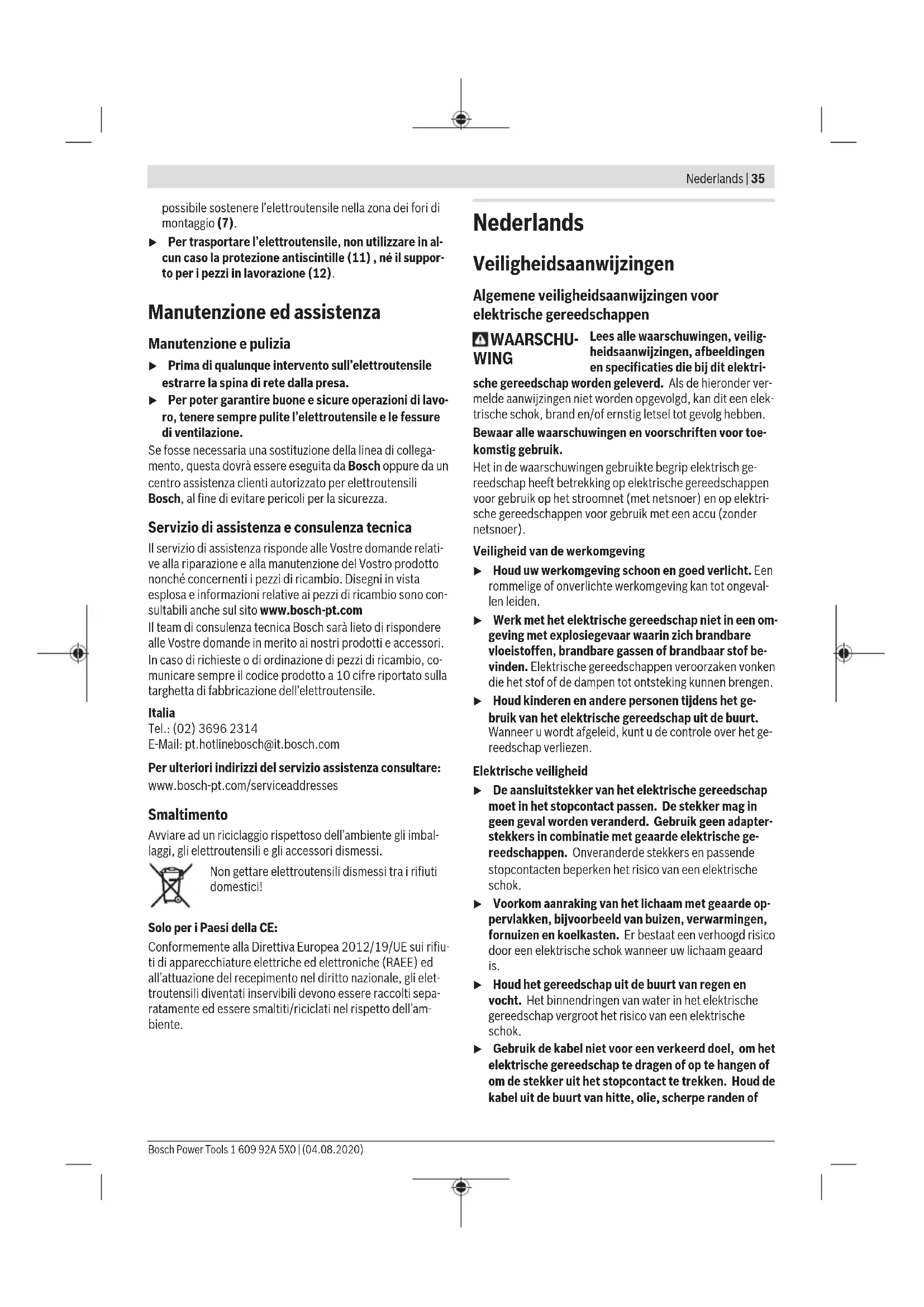 S2 (60min) Numero di giri a vuoto – 50 Hz giri/min 3000 – 60 Hz giri/min 3600 Filettatura del mandrino porta- mola M12 Dischi abrasivi – Diametro mm 200 – Larghezza mm 25 – Foro di attacco mm 32 – Grana 24/60 Flangia di attacco – Foro di attacco mm 15 – Apertura min. mm 1,5 Peso secondo EPTA-Procedure 01:2014 kg 16,5 Classe di protezione / I A) La modalità S2 (60min) identifica l’utilizzo per brevi periodi, con durata di funzionamento massima di 60 min. Trascorso tale periodo, deporre l’elettroutensile e lasciarlo raffreddare. I dati sono validi per una tensione nominale [U] di 230 V. In caso di tensioni differenti e di versioni per Paesi specifici, tali dati potranno variare. Informazioni sulla rumorosità Valori di emissione acustica rilevati conformemente a EN62841-3-4. Il livello di rumorosità ponderato A dell’elettroutensile è tipi- camente di: Livello di pressione acustica 93dB(A); Livello di potenza sonora 99dB(A). Grado d’incertezza K=3dB. Indossare protezioni acustiche! Il livello di emissione acustica indicato nelle presenti istruzio- ni è stato rilevato in conformità ad una procedura di misura- zione standardizzata e può essere utilizzato per eseguire un confronto tra gli elettroutensili. La stessa procedura è ido- nea anche per una valutazione temporanea dell’emissione acustica. Il livello di emissione acustica indicato è riferito agli impieghi principali dell’elettroutensile. Qualora l’elettroutensile venis- se utilizzato tuttavia per altre applicazioni, con accessori dif- ferenti oppure con manutenzione insufficiente, il livello di emissione acustica potrebbe variare. Ciò potrebbe aumenta- re sensibilmente l’emissione acustica per l’intero periodo di funzionamento. Per una valutazione precisa dell’emissione acustica bisogne- rebbe considerare anche i tempi in cui l’utensile è spento op- pure è acceso ma non viene effettivamente utilizzato. Ciò po- trebbe ridurre sensibilmente l’emissione acustica per l’intero periodo di funzionamento. Montaggio u Prima di qualunque intervento sull’elettroutensile estrarre la spina di rete dalla presa. – Fissare l’elettroutensile sul banco da lavoro/piano di lavo- ro mediante i quattro appositi fori (7), utilizzando viti di tipo idoneo. Montaggio della protezione antiscintille/del supporto per i pezzi in lavorazione (vedere Figg. A−D) – Montare il supporto della protezione antiscintille (10) con entrambe le viti. – Avvitare la protezione antiscintille (11) sul supporto della protezione antiscintille (10). – Montare il supporto per i pezzi in lavorazione (12) come indicato in figura. u Verificare con regolarità la distanza fra il supporto per i pezzi in lavorazione (12), o il supporto della protezio- ne antiscintille (11), registrandola all’occorrenza. La distanza dalla mola abrasiva non dovrà superare i 2mm. In caso di distanza eccessiva, l’utilizzatore non sa- rà protetto adeguatamente dalla proiezione di scintille. Il moto rotatorio della mola potrebbe attirare all’interno il pezzo in lavorazione, causando lesioni. u Utilizzare l’elettroutensile esclusivamente con la pro- tezione antiscintille (11) ed inclinarlo quanto più pos- sibile verso il basso. La proiezione di scintille può causa- re lesioni oculari o incendiare oggetti nelle vicinanze. u Utilizzare l’elettroutensile esclusivamente con il sup- porto per i pezzi in lavorazione. Non scambiare i sup- porti per i pezzi in lavorazione (12) sinistro e destro. In caso contrario, la distanza fra supporto per i pezzi in la- vorazione (12) e mola abrasiva sarà eccessiva. In caso di distanza eccessiva, l’utilizzatore non sarà protetto ade- guatamente dalla proiezione di scintille. Il moto rotatorio della mola potrebbe attirare all’interno il pezzo in lavora- zione, causando lesioni. Bosch Power Tools 1 609 92A 5X0 | (04.08.2020)34 | Italiano Sostituzione della mola abrasiva u Il numero di giri nominale dell’accessorio dovrà essere almeno pari al numero di giri massimo riportato sull’elettroutensile. Se utilizzati ad un numero di giri su- periore a quello nominale, gli accessori possono spezzarsi e proiettare parti. u Non è consentito utilizzare mole il cui diametro superi i valori riportati sull’elettroutensile. u Utilizzare l’elettroutensile esclusivamente con gli utensili accessori montati su entrambi i mandrini. In tale modo si eviterà il contatto con i mandrini in rotazione. Sostituire la mola abrasiva, qualora il supporto della prote- zione antiscintille (10) non si possa più registrare sulla di- stanza necessaria, di max. 2 mm dalla mola abrasiva. – Allentare le tre viti della copertura (1) e prelevare la co- pertura stessa. Trattenere il mandrino portamola (5) con una chiave fissa (9) e svitare il dado di serraggio (2) dal mandrino portamola (5). Avvertenza: Il mandrino portamola che fuoriesce sul lato si- nistro dell’elettroutensile (5) ha filettatura sinistrorsa. – Prelevare la flangia di serraggio (3) e la mola abrasiva dal mandrino portamola (5). – Il montaggio della mola abrasiva nuova si svolge in se- quenza inversa. Riapplicare la copertura (1) esercitando una decisa pressione e riavvitarla con le tre viti. Se una mola abrasiva è logora ed ovalizzata, prima di utiliz- zarla ulteriormente essa andrà ripresa con l’utensile per affi- lare (accessorio). u Prima di qualunque intervento sull’elettroutensile estrarre la spina di rete dalla presa. Aspirazione polvere/aspirazione trucioli Polveri e materiali come vernici contenenti piombo, alcuni ti- pi di legname, minerali e metalli possono essere dannosi per la salute. Il contatto oppure l’inalazione delle polveri possono causare reazioni allergiche e/o malattie delle vie respiratorie dell’utilizzatore, oppure delle persone che si trovano nelle vi- cinanze. Determinate polveri come polvere da legname di faggio o di quercia sono considerate cancerogene, in modo particolare insieme ad additivi per il trattamento del legna