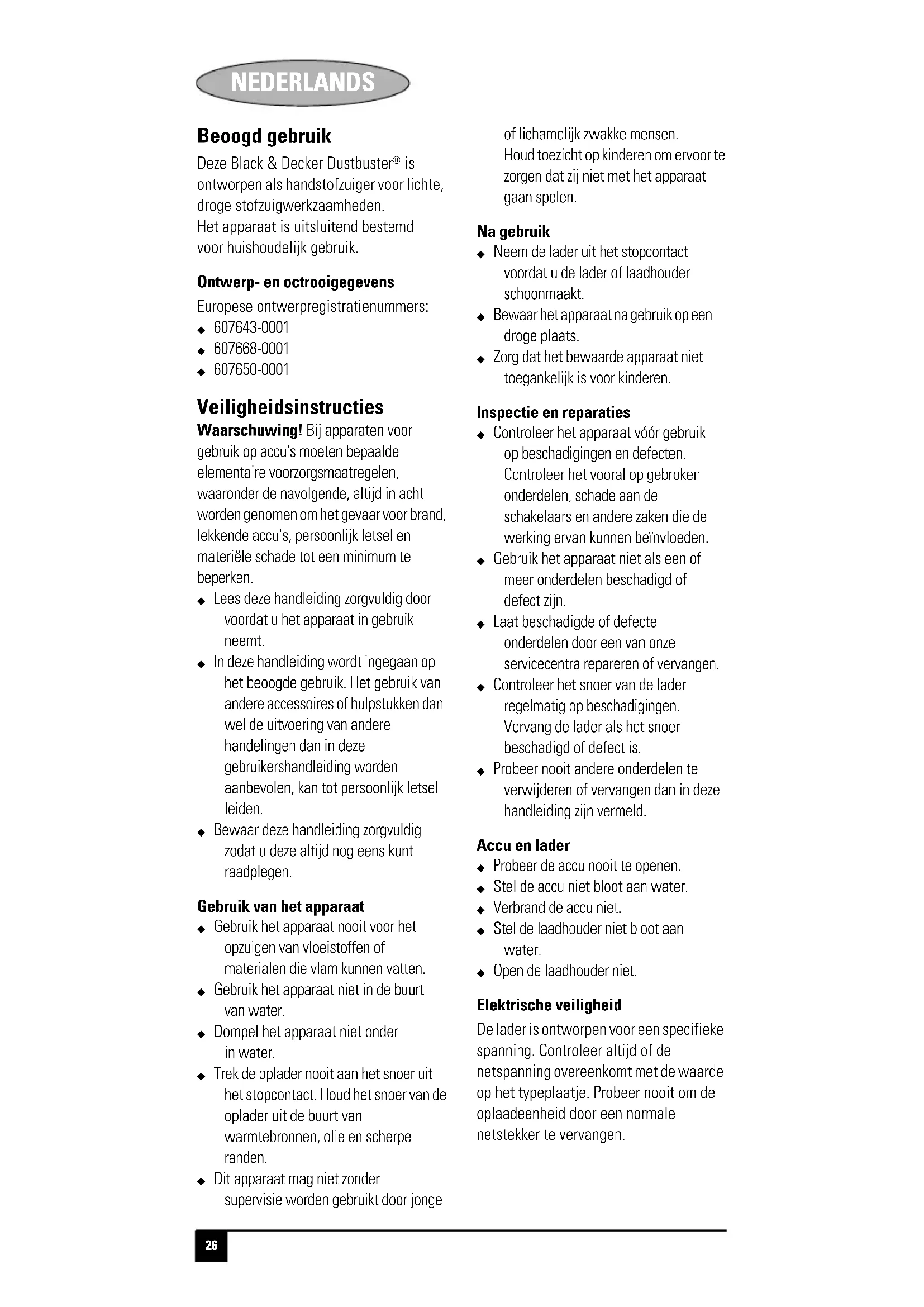 ontworpen als handstofzuiger voor lichte, droge stofzuigwerkzaamheden. Het apparaat is uitsluitend bestemd voor huishoudelijk gebruik. Ontwerp- en octrooigegevens Europese ontwerpregistratienummers: X 607643-0001X 607668-0001X 607650-0001 Veiligheidsinstructies Waarschuwing! Bij apparaten voor gebruik op accu's moeten bepaalde elementaire voorzorgsmaatregelen, waaronder de navolgende, altijd in acht worden genomen om het gevaar voor brand, lekkende accu's, persoonlijk letsel en materiële schade tot een minimum te beperken. X Lees deze handleiding zorgvuldig door voordat u het apparaat in gebruik neemt. X In deze handleiding wordt ingegaan op het beoogde gebruik. Het gebruik van andere accessoires of hulpstukken dan wel de uitvoering van andere handelingen dan in deze gebruikershandleiding worden aanbevolen, kan tot persoonlijk letsel leiden. X Bewaar deze handleiding zorgvuldig zodat u deze altijd nog eens kunt raadplegen. Gebruik van het apparaat X Gebruik het apparaat nooit voor het opzuigen van vloeistoffen of materialen die vlam kunnen vatten. X Gebruik het apparaat niet in de buurt van water. X Dompel het apparaat niet onder in water. X Trek de oplader nooit aan het snoer uit het stopcontact. Houd het snoer van de oplader uit de buurt van warmtebronnen, olie en scherpe randen. X Dit apparaat mag niet zonder supervisie worden gebruikt door jonge of lichamelijk zwakke mensen. Houd toezicht op kinderen om ervoor te zorgen dat zij niet met het apparaat gaan spelen. Na gebruik X Neem de lader uit het stopcontact voordat u de lader of laadhouder schoonmaakt. X Bewaar het apparaat na gebruik op een droge plaats. X Zorg dat het bewaarde apparaat niet toegankelijk is voor kinderen. Inspectie en reparaties X Controleer het apparaat vóór gebruik op beschadigingen en defecten. Controleer het vooral op gebroken onderdelen, schade aan de schakelaars en andere zaken die de werking ervan kunnen beïnvloeden. X Gebruik het apparaat niet als een of meer onderdelen beschadigd of defect zijn. X Laat beschadigde of defecte onderdelen door een van onze servicecentra repareren of vervangen. X Controleer het snoer van de lader regelmatig op beschadigingen. Vervang de lader als het snoer beschadigd of defect is. X Probeer nooit andere onderdelen te verwijderen of vervangen dan in deze handleiding zijn vermeld. Accu en lader X Probeer de accu nooit te openen.X Stel de accu niet bloot aan water.X Verbrand de accu niet.X Stel de laadhouder niet bloot aan water. X Open de laadhouder niet. Elektrische veiligheid De lader is ontworpen voor een specifieke spanning. Controleer altijd of de netspanning overeenkomt met de waarde op het typeplaatje. Probeer nooit om de oplaadeenheid door een normale netstekker te vervangen.NEDERLANDS