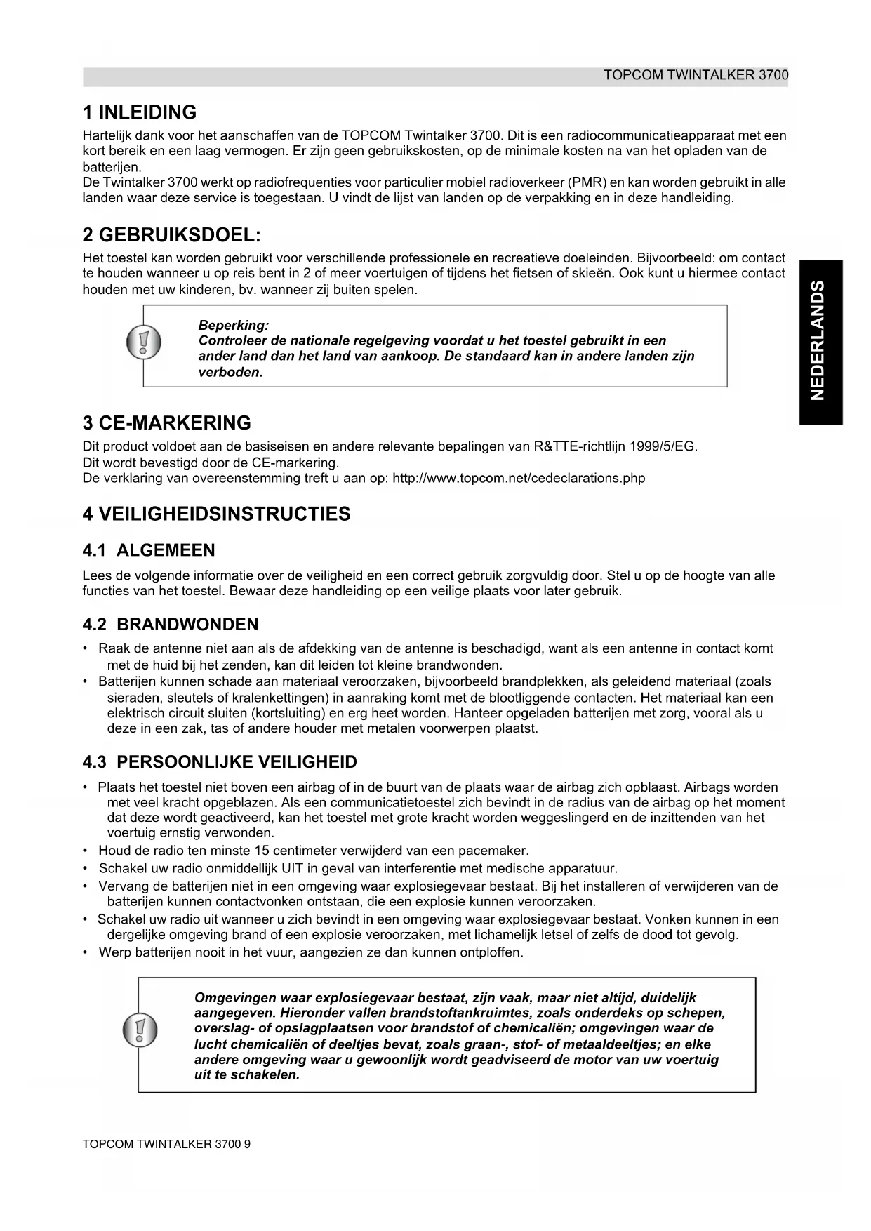 Code Frequency (Hz) Code Freq. (Hz) Code Freq. (Hz) Code Freq. (Hz) 1 446,00625 0 Disabled 10 94,8 20 131,8 30 186,2 2 446,01875 1 67,0 11 97,4 21 136,5 31 192,8 3 446,03125 2 71,9 12 100,0 22 141,3 32 203,5 4 446,04375 3 74,4 13 103,5 23 146,2 33 210,7 5 446,05625 4 77,0 14 107,2 24 151,4 34 218,1 6 446,06875 5 79,7 15 110,9 25 156,7 35 225,7 7 446,08125 6 82,5 16 114,8 26 162,2 36 233,6 8 446,09375 7 85,4 17 118,8 27 167,9 37 241,8 8 88,5 18 123,0 28 173,8 38 250,3 9 91,5 19 127,3 29 179,9TOPCOM TWINTALKER 3700 9 NEDERLANDS TOPCOM TWINTALKER 3700 1 INLEIDING Hartelijk dank voor het aanschaffen van de TOPCOM Twintalker 3700. Dit is een radiocommunicatieapparaat met een kort bereik en een laag vermogen. Er zijn geen gebruikskosten, op de minimale kosten na van het opladen van de batterijen. De Twintalker 3700 werkt op radiofrequenties voor particulier mobiel radioverkeer (PMR) en kan worden gebruikt in alle landen waar deze service is toegestaan. U vindt de lijst van landen op de verpakking en in deze handleiding. 2 GEBRUIKSDOEL: Het toestel kan worden gebruikt voor verschillende professionele en recreatieve doeleinden. Bijvoorbeeld: om contact te houden wanneer u op reis bent in 2 of meer voertuigen of tijdens het fietsen of skieën. Ook kunt u hiermee contact houden met uw kinderen, bv. wanneer zij buiten spelen. 3 CE-MARKERING Dit product voldoet aan de basiseisen en andere relevante bepalingen van R&TTE-richtlijn 1999/5/EG. Dit wordt bevestigd door de CE-markering. De verklaring van overeenstemming treft u aan op: http://www.topcom.net/cedeclarations.php 4 VEILIGHEIDSINSTRUCTIES