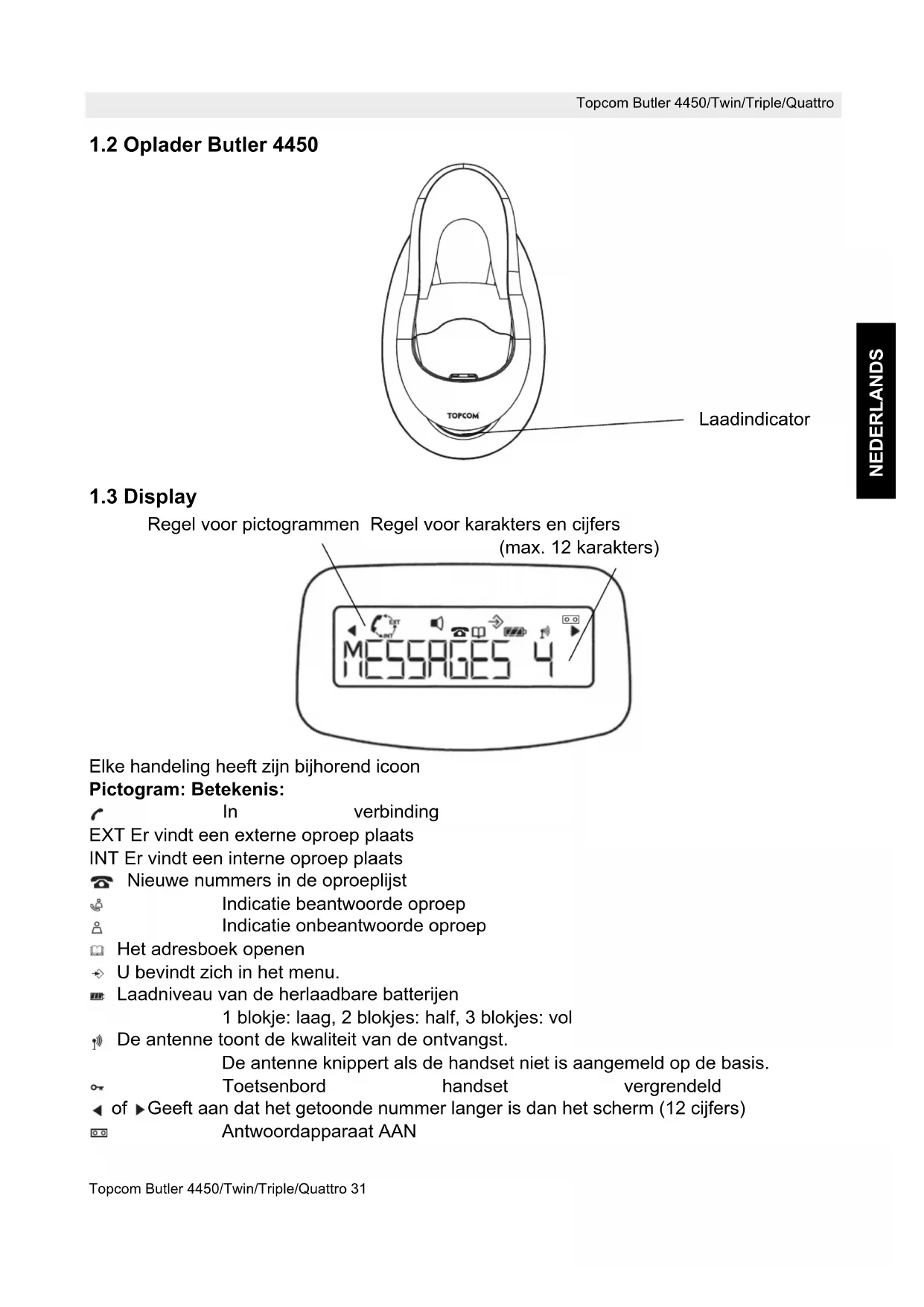 Regel voor pictogrammen Regel voor karakters en cijfers (max. 12 karakters) Elke handeling heeft zijn bijhorend icoon Pictogram: Betekenis: In verbinding EXT Er vindt een externe oproep plaats INT Er vindt een interne oproep plaats Nieuwe nummers in de oproeplijst Indicatie beantwoorde oproep Indicatie onbeantwoorde oproep Het adresboek openen U bevindt zich in het menu. Laadniveau van de herlaadbare batterijen 1 blokje: laag, 2 blokjes: half, 3 blokjes: vol De antenne toont de kwaliteit van de ontvangst. De antenne knippert als de handset niet is aangemeld op de basis. Toetsenbord handset vergrendeld of Geeft aan dat het getoonde nummer langer is dan het scherm (12 cijfers) Antwoordapparaat AAN Laadindicator32 Topcom Butler 4450/Twin/Triple/Quattro Topcom Butler 4450/Twin/Triple/Quattro