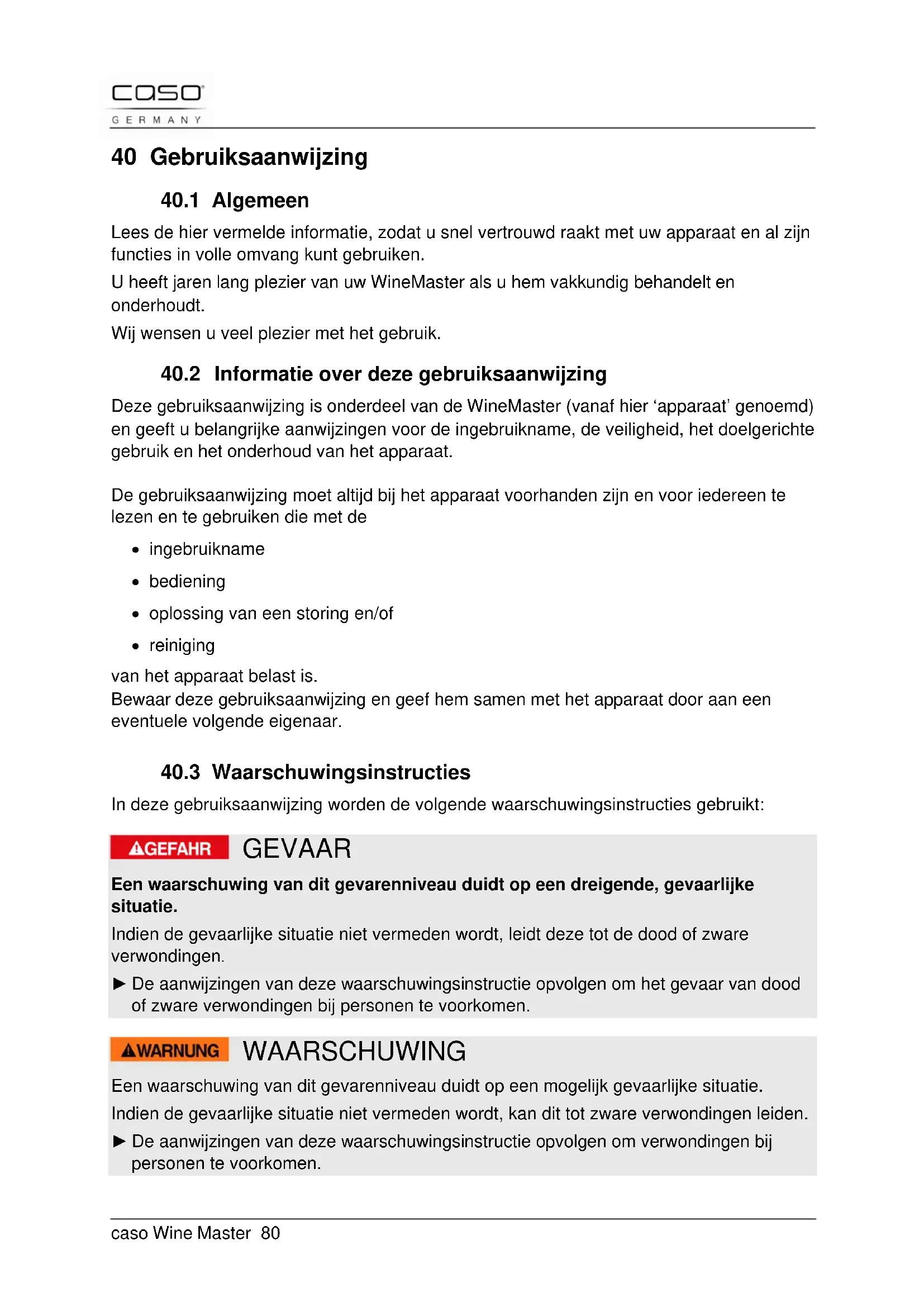 In deze gebruiksaanwijzing worden de volgende waarschuwingsinstructies gebruikt: GEVAAR Een waarschuwing van dit gevarenniveau duidt op een dreigende, gevaarlijke situatie. Indien de gevaarlijke situatie niet vermeden wordt, leidt deze tot de dood of zware verwondingen. ► De aanwijzingen van deze waarschuwingsinstructie opvolgen om het gevaar van dood of zware verwondingen bij personen te voorkomen. WAARSCHUWING Een waarschuwing van dit gevarenniveau duidt op een mogelijk gevaarlijke situatie. Indien de gevaarlijke situatie niet vermeden wordt, kan dit tot zware verwondingen leiden. ► De aanwijzingen van deze waarschuwingsinstructie opvolgen om verwondingen bij personen te voorkomen.caso Wine Master 81 VOORZICHTIG Een waarschuwing van dit gevarenniveau duidt op een mogelijk gevaarlijke situatie. Indien de gevaarlijke situatie niet vermeden wordt, kan dit tot lichte of matige verwondingen leiden. ► De aanwijzingen van deze waarschuwingsinstructie opvolgen om verwondingen bij personen te voorkomen. TIP Een tip duidt op extra informatie, die de omgang met het apparaat lichter maakt.