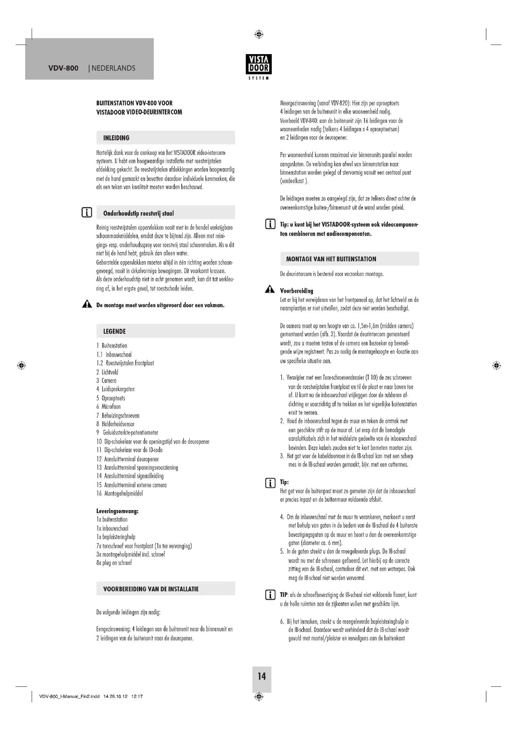 Hartelijk dank voor de aankoop van het VISTADOOR video-intercomsystem. U heb een hoogwaardige installmentie met roestvijstalen afdekking gekocht. De roestvijstalen afdekkingen worden hoogwaardig met de hand gemaakt en bevatten daardoor individuèle kenmerken, die als een teken van kwaliteit要去en worden beschouwd.