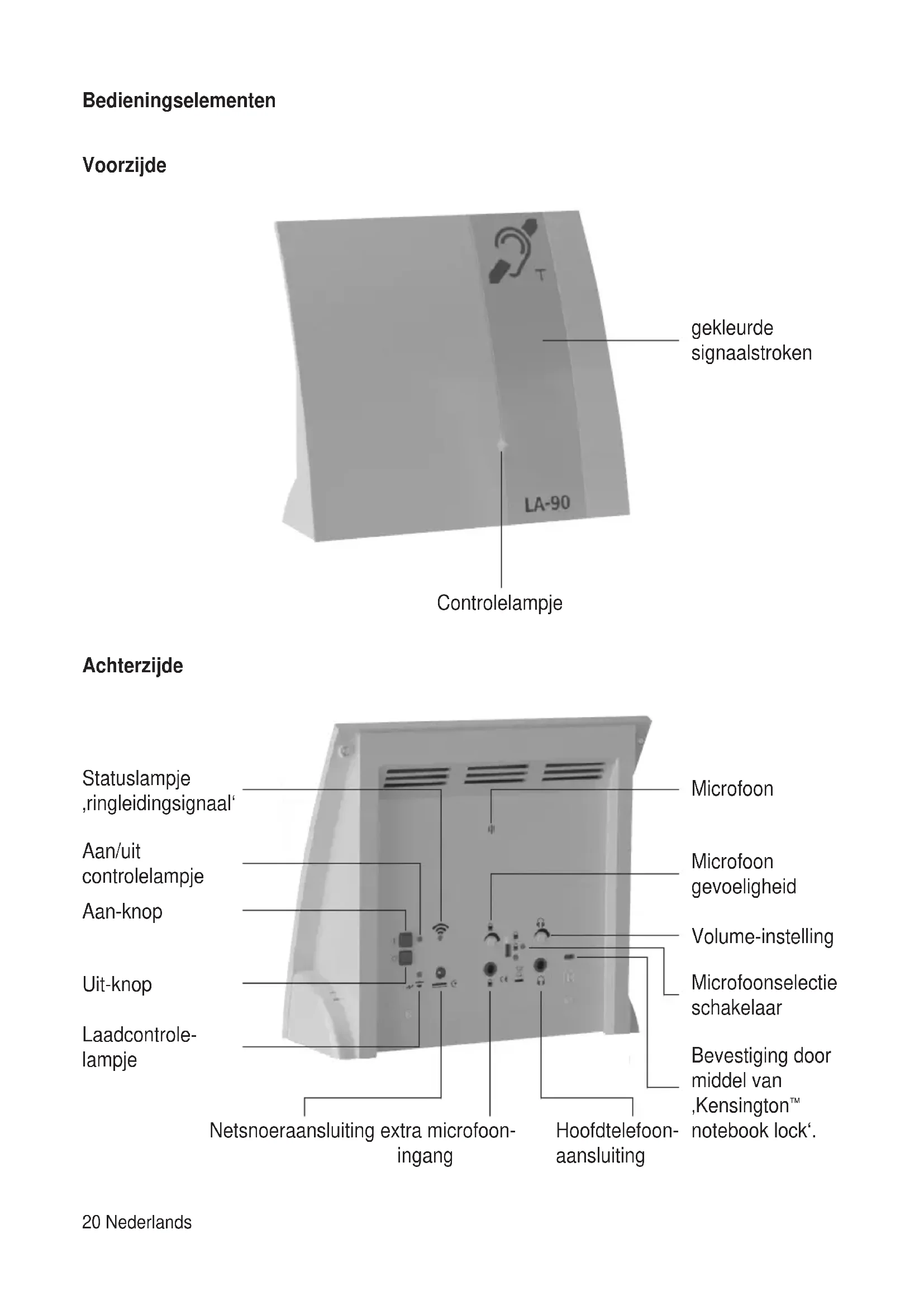 Het inductielussystem is al in de behuizing geinstalleerd en ingesteld. U hoeft alleen de LA-90 neer te zetten op de gewensteplaats tussen u en de persoon met wie u spreekt, en de voedingseenheid aan te sluiten. Denk eraan dat de microloon aan dechterzijde van het apparaat maar de spreker toe geleerd moet+zijn.