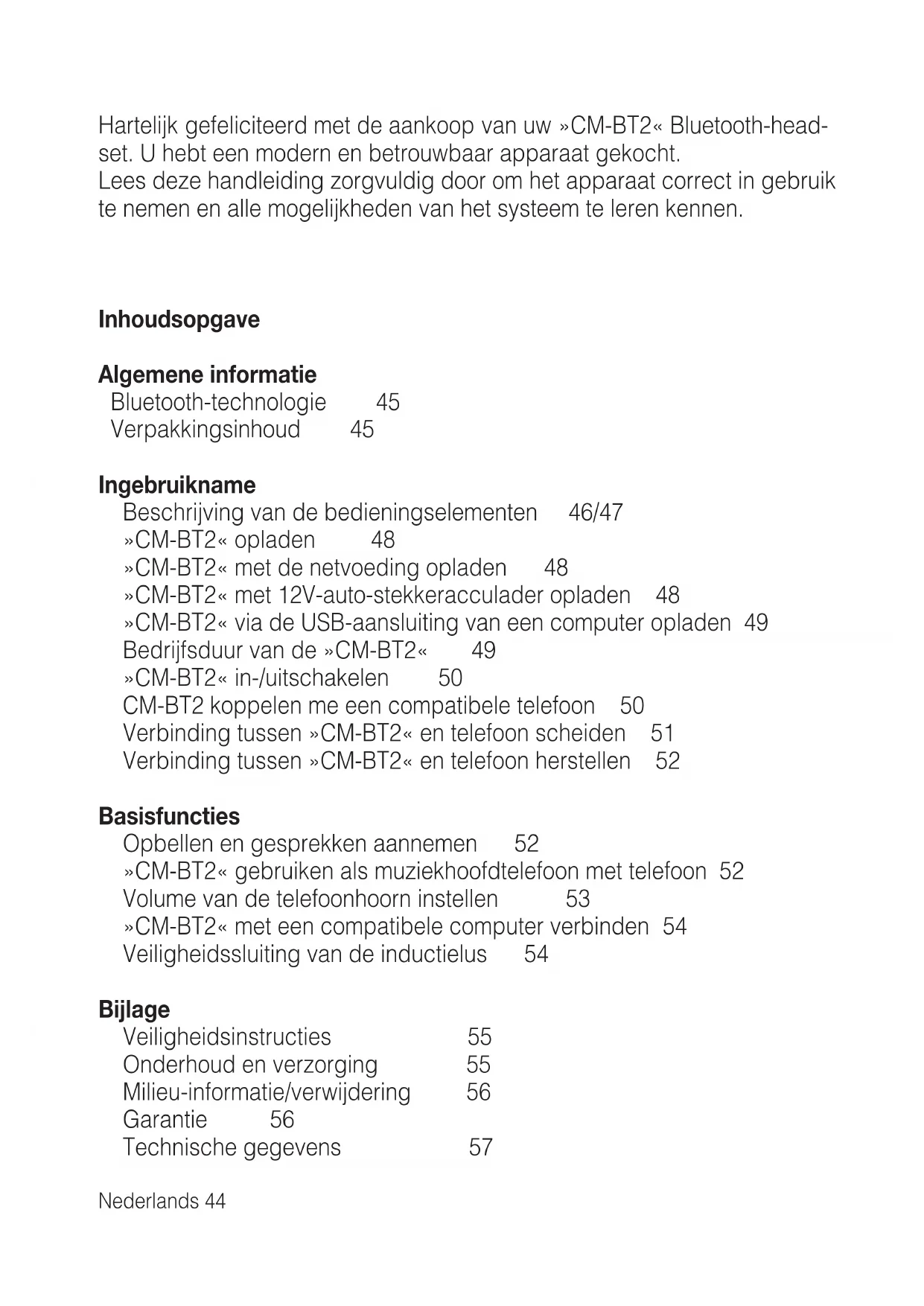 Hartelijk gefeliciteerd met de aankoop van uw «CM-BT2« Bluetooth-headset. U heb een modern en betrouwbaar apparaat gekocht.