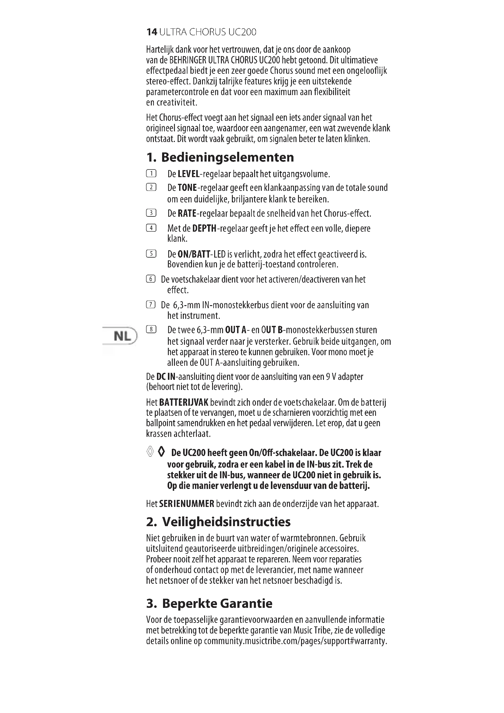 Collegamento Monoattacco a nottolino da 6,3-mm Impedenza 500 k Out A Collegamento Monoattacco a nottolino da 6,3-mm Impedenza 1 k Out B Collegamento Monoattacco a nottolino da 6,3-mm Impedenza 1 k Alimentazione Elettrica 9 V 𝌂, 100 mA regolata Behringer PSU-SB USA/Canada 120 V~, 60 Hz Cina/Corea 220 V~, 50 Hz U.K./Australia 240 V~, 50 Hz Europa 230 V~, 50 Hz Giappone 100 V~, 50 - 60 Hz Allacciamento Collegamento 2-mm DC, alla rete Center negativo Batteria 9 V Tipo 6LR61 Potenza assorbita 30 mA Dimensioni/Peso Dimensioni ca. 2 ⁄ x 2 ¾ x 4 ⁄" (A x L x P) ca. 54 x 70 x 123 mm Peso ca. 0,73 lbs / 0,33 kg La ditta Behringer è sempre impegnata a garantire il massimo livello qualitativo. Modifiche necessarie saranno eseguite senza alcun preavviso. I dati tecnici e l’aspetto dell’apparecchio possono quindi divergere dalle indicazioni e le illustrazioni riportate.14 ULTRA CHORUS UC200 Hartelijk dank voor het vertrouwen, dat je ons door de aankoop van de BEHRINGER ULTRA CHORUS UC200 hebt getoond. Dit ultimatieve eectpedaal biedt je een zeer goede Chorus sound met een ongelooijk stereo-eect. Dankzij talrijke features krijg je een uitstekende parametercontrole en dat voor een maximum aan exibiliteit en creativiteit. Het Chorus-eect voegt aan het signaal een iets ander signaal van het origineel signaal toe, waardoor een aangenamer, een wat zwevende klank ontstaat. Dit wordt vaak gebruikt, om signalen beter te laten klinken.