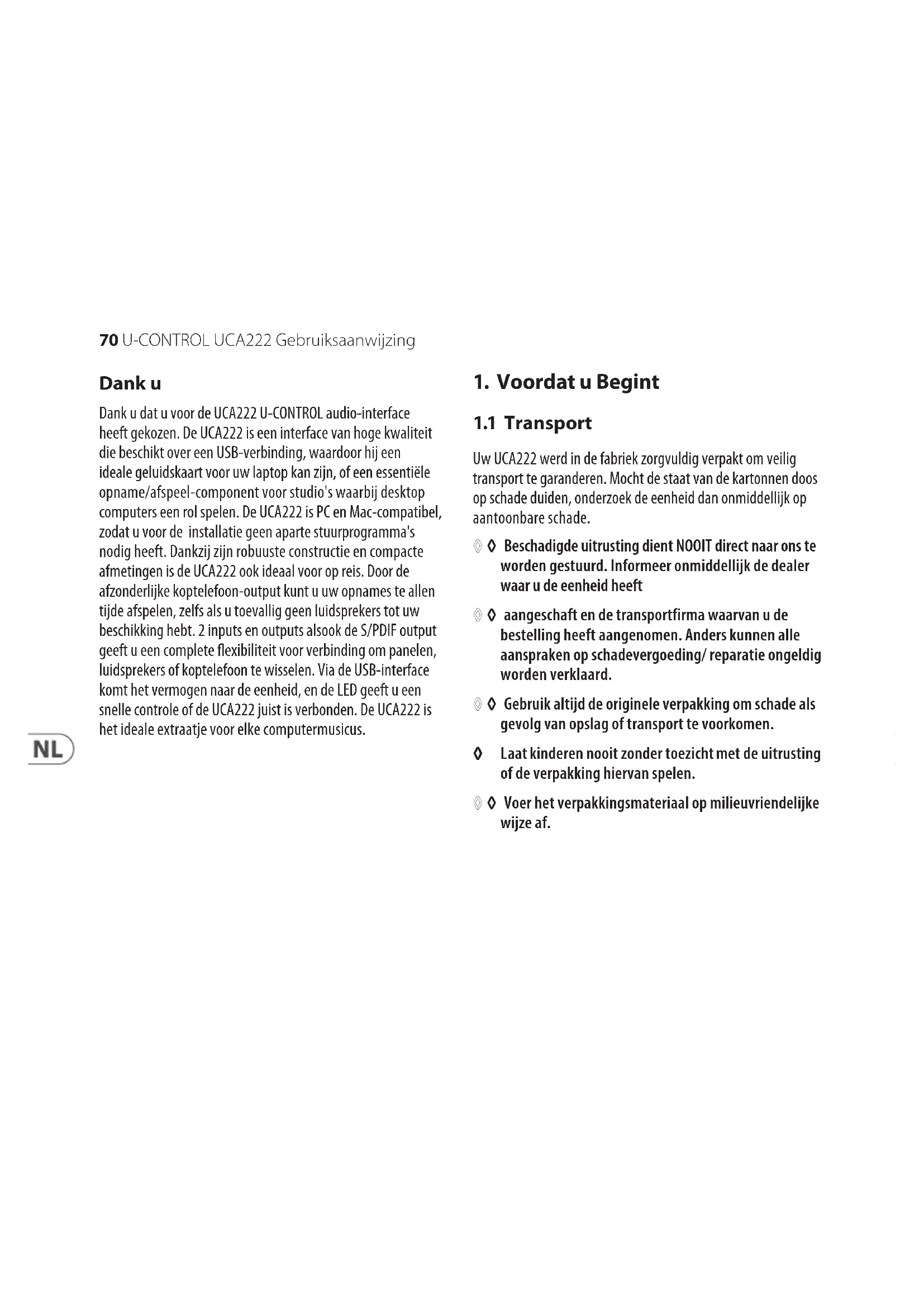 Uw UCA222 werd in de fabriek zorgvuldig verpakt om veilig transport te garanderen. Mocht de staat van de kartonnen doos op schade duiden, onderzoekde eenheid dan onmiddellijk op aantoonbare schade. ◊ ◊ Beschadigde uitrusting dient NOOIT direct naar ons te worden gestuurd. Informeer onmiddellijk de dealer waar u de eenheid heeft ◊ ◊ aangeschaft en de transportfirma waarvan u de bestelling heeft aangenomen. Anders kunnen alle aanspraken op schadevergoeding/ reparatie ongeldig worden verklaard. ◊ ◊ Gebruik altijd de originele verpakking om schade als gevolg van opslag of transport te voorkomen. ◊ ◊ Laat kinderen nooit zonder toezicht met de uitrusting of de verpakking hiervan spelen. ◊ ◊ Voer het verpakkingsmateriaal op milieuvriendelijke wijze af.71 U-CONTROL UCA222 Gebruiksaanwijzing