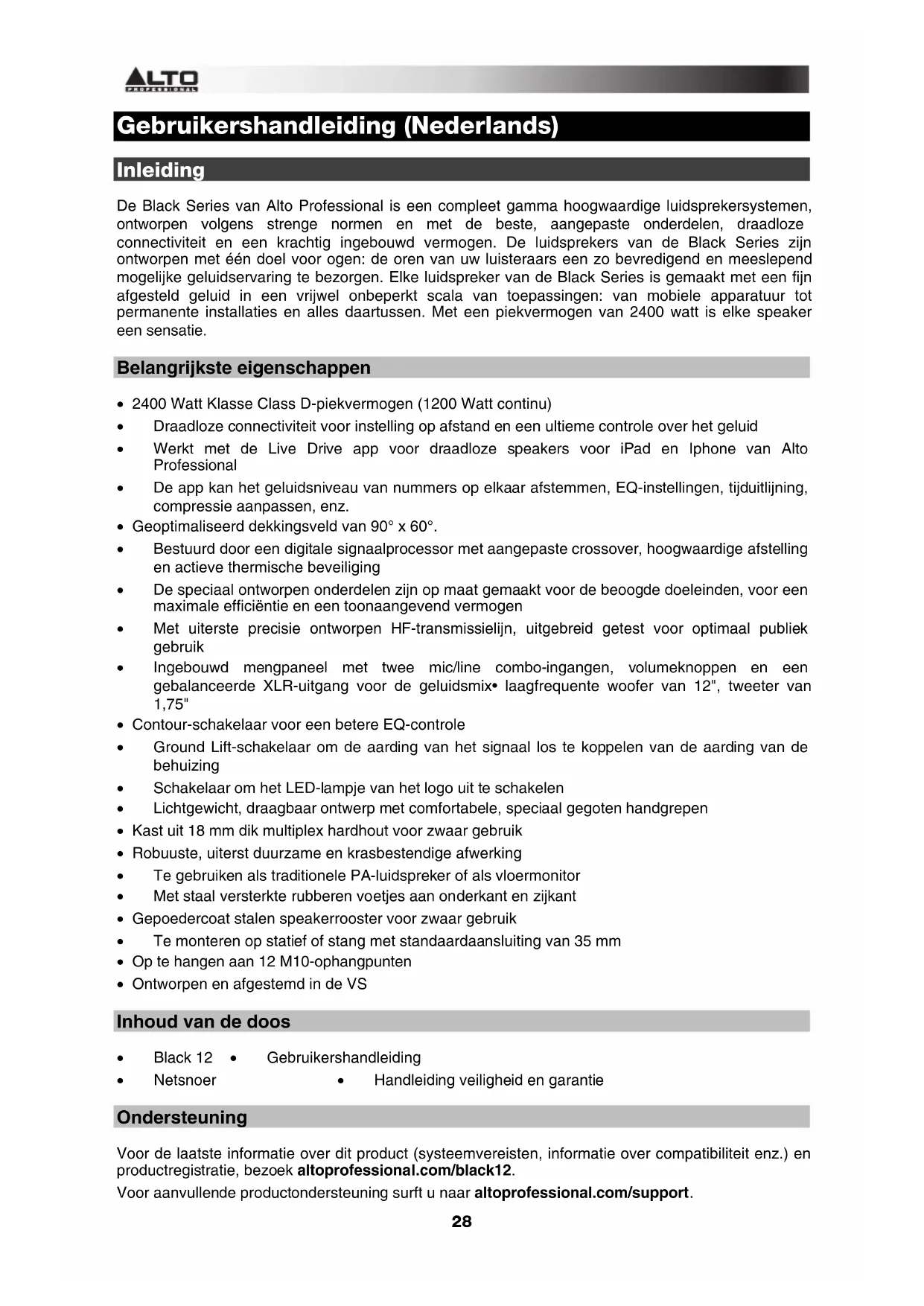 - Netsnoer • Handleiding veiligheid en garantie Ondersteuning Voor de laatste informatie over dit product (systeemvereisten, informatie over compatibiliteit enz.) en productregistratie, bezoek altoprofessional.com/black12. Voor aanvullende productondersteuning surft u naar altoprofessional.com/support.29