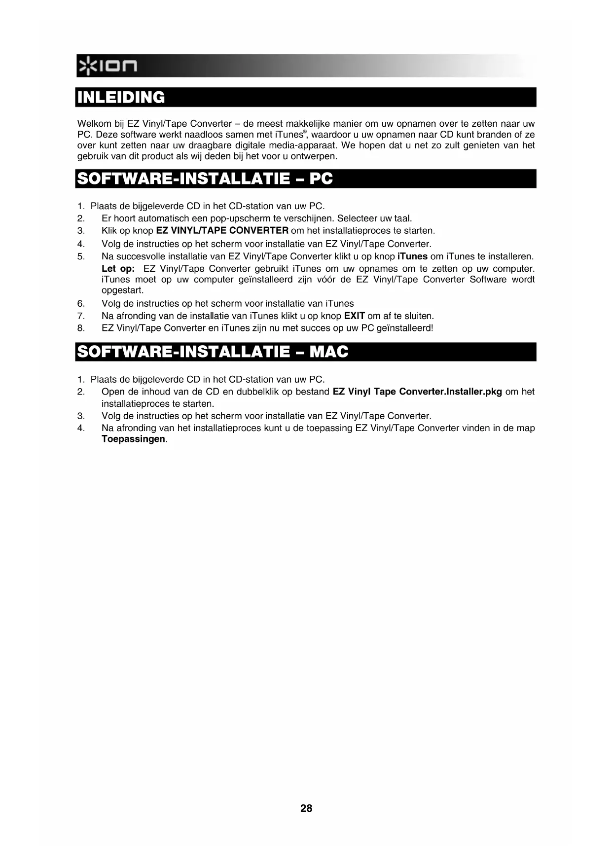 USB-apparaat heeft geen stroom. Als uw apparaat over een aan/uitknop beschikt, zorg er dan voor dat het USB-apparaat is ingeschakeld. USB-apparaat niet aangeslo- ten op de PC. Zorg ervoor dat het USB-apparaat is aangesloten op een werkende USB- poort van de PC. Als het apparaat al aangesloten is, probeer het dan opnieuw aan te sluiten en start de software opnieuw. Ik hoor geen geluid wanneer ik aan het opnemen ben en ik zie de geluidsmeters niet bewegen. Slechte USB-kabel of USB- poort. Probeer een andere USB-kabel. Probeer het USB-apparaat aan te sluiten op een andere USB-poort van de PC. Geluidsuitgang is niet juist ingesteld. Zorg ervoor dat de geluidskaart van de PC geselecteerd is als afspeelapparaat. Windows XP: Klik op Start Bedieningspaneel (of Instellingen Bedieningspaneel in Klassieke weergave) Geluid en audio-apparaten. Klik op het tabblad Geluid en selecteer onder Geluid afspelen de geluidskaart van uw computer als standaardapparaat. Windows Vista: Klik op Start Bedieningspaneel (of Instellingen Bedieningspaneel in Klassieke weergave) Hardware en geluid Geluid. Klik op het tabblad Afspelen en selecteer de geluidskaart van uw computer als standaardapparaat. Windows 7: Klik op Start Bedieningspaneel Geluid. Klik op het tabblad Afspelen en selecteer de geluidskaart van uw computer als standaardapparaat. Mac: Klik op het “Apple”-pictogram in de linkerbovenhoek en klik op Systeemvoorkeuren Geluid. Klik op het tabblad Uitvoer. Selecteer Interne luidsprekers in het menu als u gebruik maakt van de interne luidsprekers van uw computer of selecteer Hoofdtelefoon als u luidsprekers of een hoofdtelefoon gebruikt die zijn aangesloten op de 1/8”- koptelefoonuitgang van de computer. Volumeknop van de boxen staat te laag. Verhoog het volume van de boxen van de PC. De muziek wordt afgespeeld en ik zie de geluidsmeters bewegen, maar ik hoor geen geluid. Boxen zijn niet aangesloten op de computer. Zorg er bij gebruik van externe boxen voor dat deze aangesloten zijn op de geluidskaart van de PC. Aansluiting van het element is niet in orde. Bij gebruik van een USB-draaitafel dient het element stevig bevestigd te zijn aan de toonarm wanneer de draaitafel in gebruik is. Vinyl plaat is vuil of bescha- digd. Probeer, bij het overzetten van platen, de plaat af te stoffen en veeg het oppervlak voorzichtig schoon voordat de plaat afgespeeld wordt. Andere toepassingen hinderen EZ Vinyl/Tape Converter. Sluit alle toepassingen af, herstart de PC en gebruik alleen EZ Vinyl/Tape Converter tijdens het opnemen. De geluidskwaliteit is slecht. Uw naald kan ze kapot of versleten zijn. Draaitafels alleen: als uw naald meer dan een jaar oud is of veelvuldig wordt gebruikt, kan ze kapot of versleten zijn. Neem contact op met ION Audio-onderdelen om een andere naald aan te schaffen. De opname klinkt luid en vervormd. Het versterkingsniveau is te hoog. De opname is nauwelijks hoorbaar. Het versterkingsniveau is te laag. Als uw USB-apparaat is uitgerust met een “gain”-knop, pas hem dan aan indien nodig. U kunt ook de gain-schuifknop in de software naast de volumemeter aanpassen (het luidste deel van het nummer moet het oranje deel van de meter bereiken). Als u nog steeds ontevreden bent met het gain-niveau, zelfs na het aanpassen van de schuifknop in de software, voorzien de meeste besturingssystemen van computers een schuifknop voor het ingangsniveau die u kunt aanpassen: Windows XP: (niet beschikbaar) Windows Vista: Klik op Start Bedieningspaneel (of Instellingen Bedieningspaneel in Klassieke weergave) Hardware en geluid Geluid. Klik op het tabblad Opnemen en selecteer “USB Audiocodec” als standaardapparaat. Klik op Kenmerken: Klik in het nieuwe venster op het tabblad Niveaus en pas de schuifknop Microfoon aan. Wij raden aan het niveau in te stellen op “4”. Windows 7: Klik op Start Bedieningspaneel Geluid. Klik op het tabblad Opnemen en selecteer “USB Audiocodec” als standaardapparaat. Klik op Kenmerken: Klik in het nieuwe venster op het tabblad Niveaus en pas de schuifknop Microfoon aan. Wij raden aan het niveau in te stellen op “4”. Mac: Klik op het “Apple”-pictogram in de linkerbovenhoek en klik op Systeemvoorkeuren Geluid. Klik op het tabblad Invoer en zorg ervoor dat uw USB-apparaat is gemarkeerd. Selecteer in het menu uw USB- opname-apparaat en pas de schuifknop Ingangsvolume naar behoren aan.32