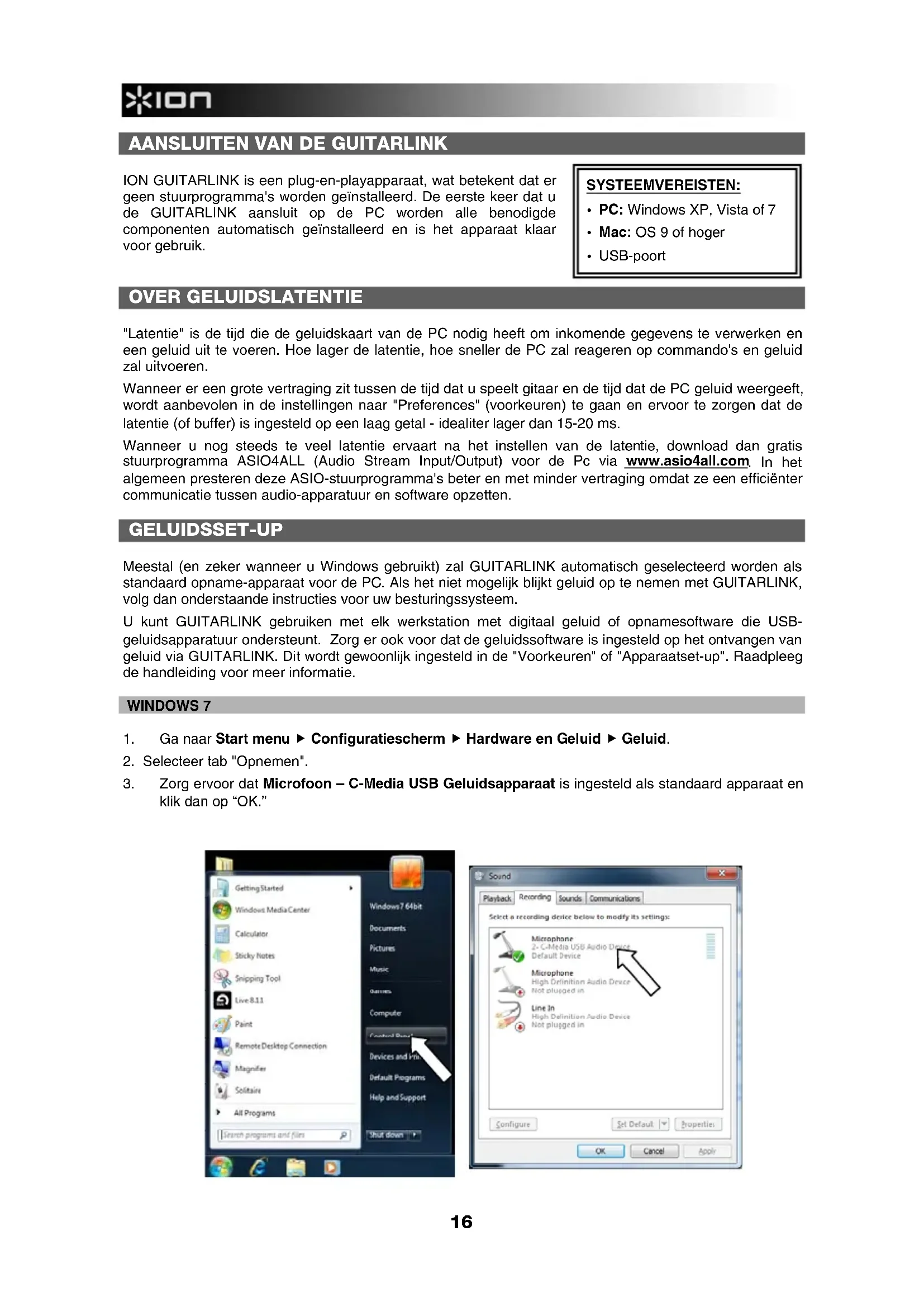 OVER GELUIDSLATENTIE "Latentie" is de tijd die de geluidskaart van de PC nodig heeft om inkomende gegevens te verwerken en een geluid uit te voeren. Hoe lager de latentie, hoe sneller de PC zal reageren op commando's en geluid zal uitvoeren. Wanneer er een grote vertraging zit tussen de tijd dat u speelt gitaar en de tijd dat de PC geluid weergeeft, wordt aanbevolen in de instellingen naar "Preferences" (voorkeuren) te gaan en ervoor te zorgen dat de latentie (of buffer) is ingesteld op een laag getal - idealiter lager dan 15-20 ms. Wanneer u nog steeds te veel latentie ervaart na het instellen van de latentie, download dan gratis stuurprogramma ASIO4ALL (Audio Stream Input/Output) voor de Pc via www.asio4all.com . In het algemeen presteren deze ASIO-stuurprogramma's beter en met minder vertraging omdat ze een efficiënter communicatie tussen audio-apparatuur en software opzetten. GELUIDSSET-UP Meestal (en zeker wanneer u Windows gebruikt) zal GUITARLINK automatisch geselecteerd worden als standaard opname-apparaat voor de PC. Als het niet mogelijk blijkt geluid op te nemen met GUITARLINK, volg dan onderstaande instructies voor uw besturingssysteem. U kunt GUITARLINK gebruiken met elk werkstation met digitaal geluid of opnamesoftware die USB- geluidsapparatuur ondersteunt. Zorg er ook voor dat de geluidssoftware is ingesteld op het ontvangen van geluid via GUITARLINK. Dit wordt gewoonlijk ingesteld in de "Voorkeuren" of "Apparaatset-up". Raadpleeg de handleiding voor meer informatie. WINDOWS 7
