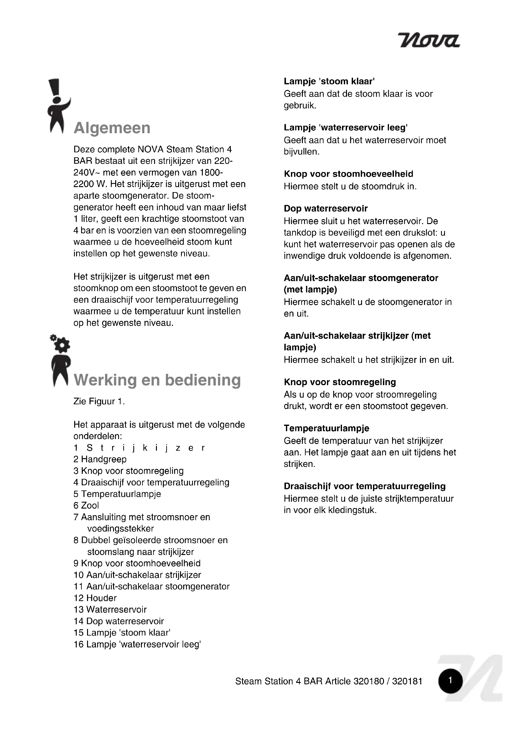 Steam Station 4 BAR Article 320180 / 320181 Algemeen Deze complete NOVA Steam Station 4 BAR bestaat uit een strijkijzer van 220- 240V~ met een vermogen van 1800- 2200 W. Het strijkijzer is uitgerust met een aparte stoomgenerator. De stoom- generator heeft een inhoud van maar liefst 1 liter, geeft een krachtige stoomstoot van 4 bar en is voorzien van een stoomregeling waarmee u de hoeveelheid stoom kunt instellen op het gewenste niveau. Het strijkijzer is uitgerust met een stoomknop om een stoomstoot te geven en een draaischijf voor temperatuurregeling waarmee u de temperatuur kunt instellen op het gewenste niveau. Werking en bediening Zie Figuur 1. Het apparaat is uitgerust met de volgende onderdelen: 1Strijkijzer 2 Handgreep 3 Knop voor stoomregeling 4 Draaischijf voor temperatuurregeling 5 Temperatuurlampje 6 Zool 7 Aansluiting met stroomsnoer en voedingsstekker 8 Dubbel geïsoleerde stroomsnoer en stoomslang naar strijkijzer 9 Knop voor stoomhoeveelheid 10 Aan/uit-schakelaar strijkijzer 11 Aan/uit-schakelaar stoomgenerator 12 Houder 13 Waterreservoir 14 Dop waterreservoir 15 Lampje 'stoom klaar' 16 Lampje 'waterreservoir leeg' Lampje 'stoom klaar' Geeft aan dat de stoom klaar is voor gebruik. Lampje 'waterreservoir leeg' Geeft aan dat u het waterreservoir moet bijvullen. Knop voor stoomhoeveelheid Hiermee stelt u de stoomdruk in. Dop waterreservoir Hiermee sluit u het waterreservoir. De tankdop is beveiligd met een drukslot: u kunt het waterreservoir pas openen als de inwendige druk voldoende is afgenomen. Aan/uit-schakelaar stoomgenerator (met lampje) Hiermee schakelt u de stoomgenerator in en uit. Aan/uit-schakelaar strijkijzer (met lampje) Hiermee schakelt u het strijkijzer in en uit. Knop voor stoomregeling Als u op de knop voor stroomregeling drukt, wordt er een stoomstoot gegeven. Temperatuurlampje Geeft de temperatuur van het strijkijzer aan. Het lampje gaat aan en uit tijdens het strijken. Draaischijf voor temperatuurregeling Hiermee stelt u de juiste strijktemperatuur in voor elk kledingstuk.2 Steam Station 4 BAR Article 320180 / 320181 Voor het eerste gebruik
