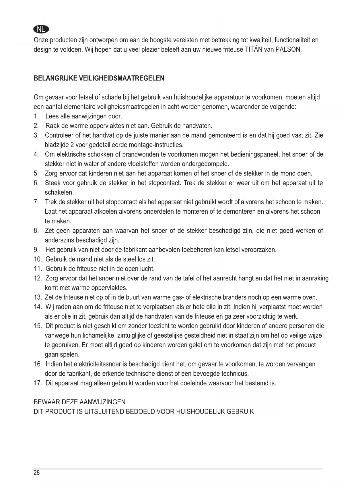 Onze producten zijn ontworpen om aan de hoogste vereisten met betrekking tot kwaliteit, functionaliteit en design te voldoen. Wij hopen dat u veel plezier beleeft aan uw nieuwe friteuse TITÁN van PALSON.