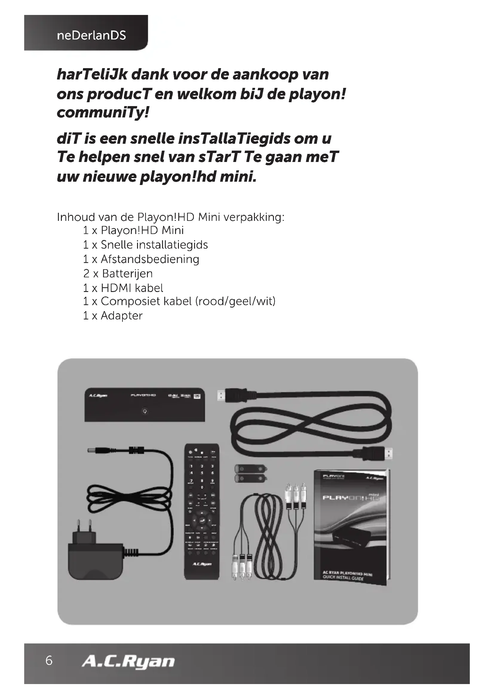 SLOW ANGLE A-B PLAY STOP SELECTCONFIRMAUDIOSUBTITLEHOME REPEAT GOTO RETURN MENU VOL FULL HD harTelijk dank voor de aankoop van ons producT en welkom bij de playon! communiTy! diT is een snelle insTallaTiegids om u Te helpen snel van sTarT Te gaan meT uw nieuwe playon!hd mini. Inhoud van de Playon!HD Mini verpakking: 1 x Playon!HD Mini 1 x Snelle installatiegids 1 x Afstandsbediening 2 x Batterijen 1 x HDMI kabel 1 x Composiet kabel (rood/geel/wit) 1 x Adapter