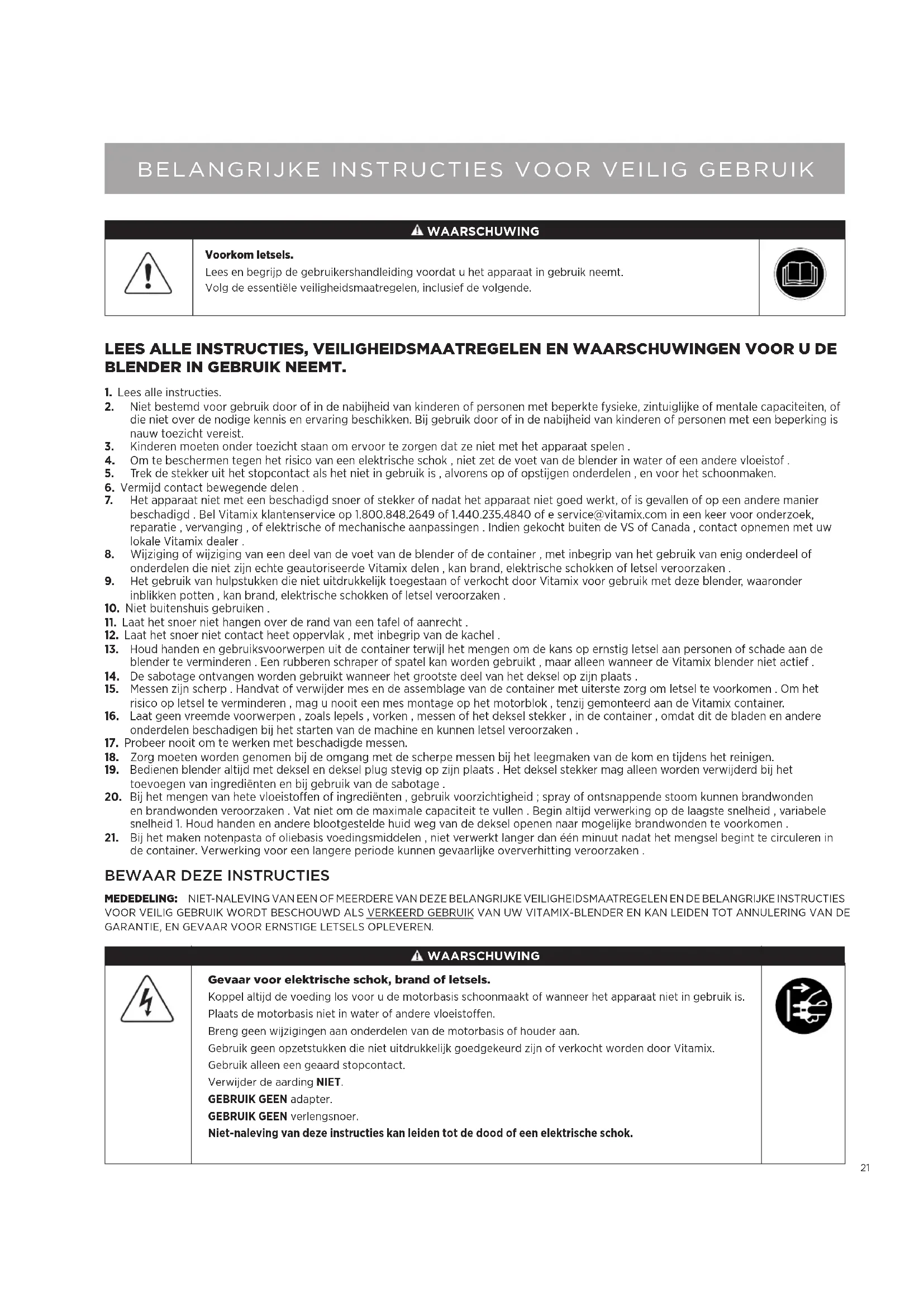 7. Het apparaat niet met een beschadigd snoer of stekker of nadat het apparaat niet goed werkt, of is gevallen of op een andere manier beschadigd . Bel Vitamix klantenservice op 1.800.848.2649 of 1.440.235.4840 of e service@vitamix.com in een keer voor onderzoek, reparatie , vervanging , of elektrische of mechanische aanpassingen . Indien gekocht buiten de VS of Canada , contact opnemen met uw lokale Vitamix dealer . 8. Wijziging of wijziging van een deel van de voet van de blender of de container , met inbegrip van het gebruik van enig onderdeel of onderdelen die niet zijn echte geautoriseerde Vitamix delen , kan brand, elektrische schokken of letsel veroorzaken . 9. Het gebruik van hulpstukken die niet uitdrukkelijk toegestaan of verkocht door Vitamix voor gebruik met deze blender, waaronder inblikken potten , kan brand, elektrische schokken of letsel veroorzaken .