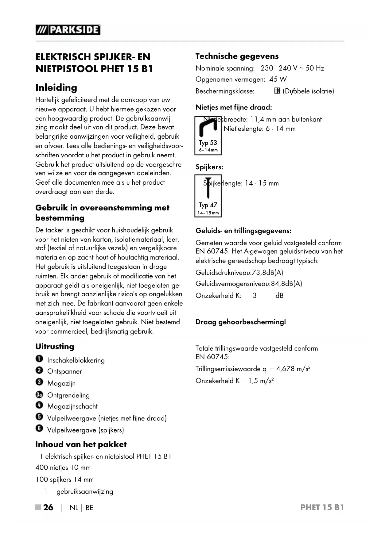 Inleiding Hartelijk gefeliciteerd met de aankoop van uw nieuwe apparaat. U hebt hiermee gekozen voor een hoogwaardig product. De gebruiksaanwij- zing maakt deel uit van dit product. Deze bevat belangrijke aanwijzingen voor veiligheid, gebruik en afvoer. Lees alle bedienings- en veiligheidsvoor- schriften voordat u het product in gebruik neemt. Gebruik het product uitsluitend op de voorgeschre- ven wijze en voor de aangegeven doeleinden. Geef alle documenten mee als u het product overdraagt aan een derde. Gebruik in overeenstemming met bestemming De tacker is geschikt voor huishoudelijk gebruik voor het nieten van karton, isolatiemateriaal, leer, stof (textiel of natuurlijke vezels) en vergelijkbare materialen op zacht hout of houtachtig materiaal. Het gebruik is uitsluitend toegestaan in droge ruimten. Elk ander gebruik of modificatie van het apparaat geldt als oneigenlijk, niet toegelaten ge- bruik en brengt aanzienlijke risico's op ongelukken met zich mee. De fabrikant aanvaardt geen enkele aansprakelijkheid voor schade die voortvloeit uit oneigenlijk, niet toegelaten gebruik. Niet bestemd voor commercieel, bedrijfsmatig gebruik. Uitrusting Inschakelblokkering Ontspanner Magazijn Ontgrendeling Magazijnschacht Vulpeilweergave (nietjes met fijne draad) Vulpeilweergave (spijkers) Inhoud van het pakket 1 elektrisch spijker- en nietpistool PHET 15 B1 400 nietjes 10 mm 100 spijkers 14 mm 1 gebruiksaanwijzing Technische gegevens Nominale spanning: 230 - 240 V ∼ 50 Hz Opgenomen vermogen: 45 W Beschermingsklasse: II / (Dubbele isolatie) Nietjes met fijne draad: Nietjesbreedte: 11,4 mm aan buitenkant Nietjeslengte: 6 - 14 mm Spijkers: Spijkerlengte: 14 - 15 mm Geluids- en trillingsgegevens: Gemeten waarde voor geluid vastgesteld conform EN 60745. Het A-gewogen geluidsniveau van het elektrische gereedschap bedraagt typisch: Geluidsdrukniveau: 73,8 dB(A) Geluidsvermogensniveau: 84,8 dB(A) Onzekerheid K: 3 dB Draag gehoorbescherming! Totale trillingswaarde vastgesteld conform EN 60745: Trillingsemissiewaarde a