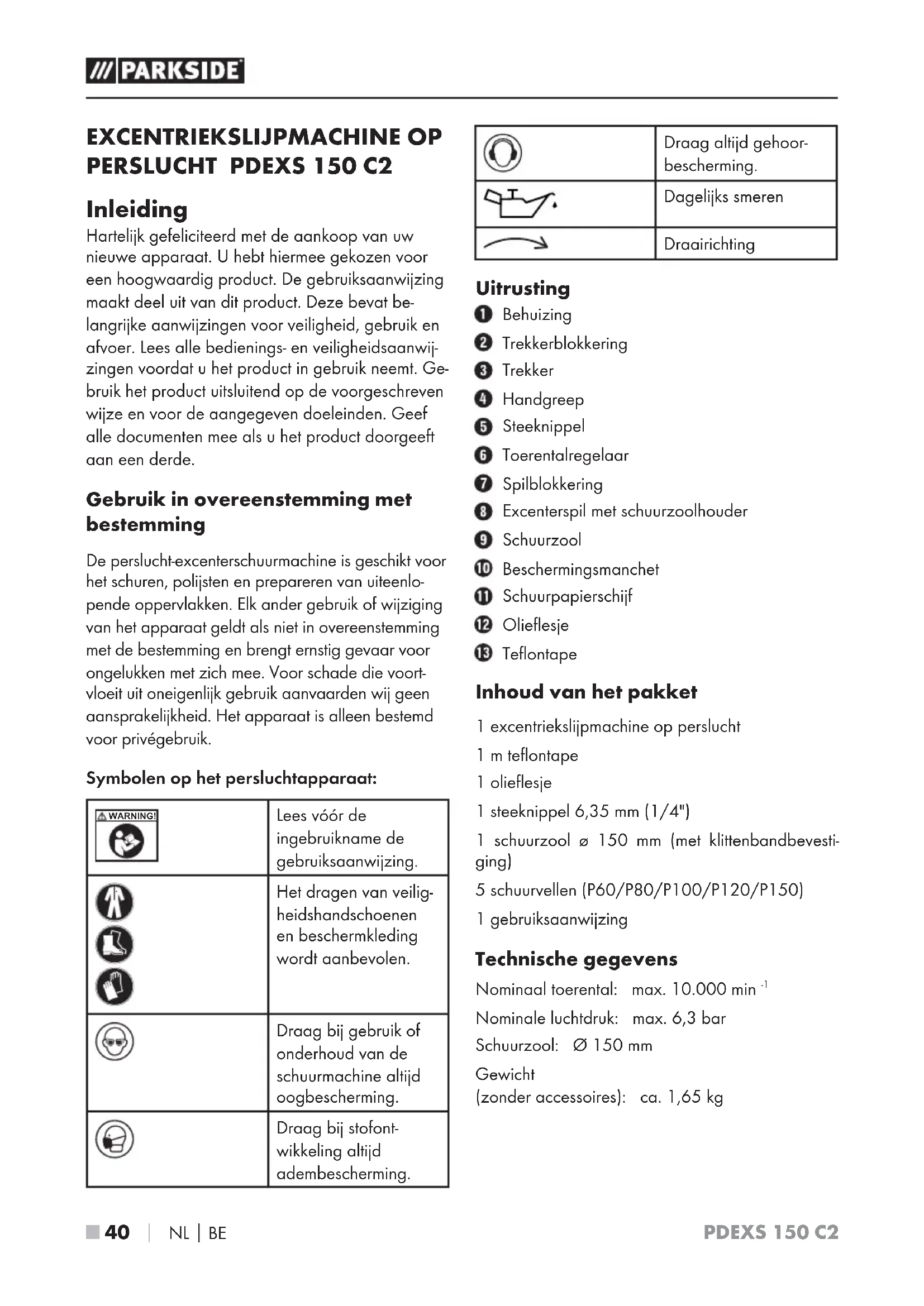 Inleiding Hartelijk gefeliciteerd met de aankoop van uw nieuwe apparaat. U hebt hiermee gekozen voor een hoogwaardig product. De gebruiksaanwijzing maakt deel uit van dit product. Deze bevat be- langrijke aanwijzingen voor veiligheid, gebruik en afvoer. Lees alle bedienings- en veiligheidsaanwij- zingen voordat u het product in gebruik neemt. Ge- bruik het product uitsluitend op de voorgeschreven wijze en voor de aangegeven doeleinden. Geef alle documenten mee als u het product doorgeeft aan een derde. Gebruik in overeenstemming met bestemming De perslucht-excenterschuurmachine is geschikt voor het schuren, polijsten en prepareren van uiteenlo- pende oppervlakken. Elk ander gebruik of wijziging van het apparaat geldt als niet in overeenstemming met de bestemming en brengt ernstig gevaar voor ongelukken met zich mee. Voor schade die voort- vloeit uit oneigenlijk gebruik aanvaarden wij geen aansprakelijkheid. Het apparaat is alleen bestemd voor privégebruik. Symbolen op het persluchtapparaat: WARNING! Lees vóór de ingebruikname de gebruiksaanwijzing. Het dragen van veilig- heidshandschoenen en beschermkleding wordt aanbevolen. Draag bij gebruik of onderhoud van de schuurmachine altijd oogbescherming. Draag bij stofont- wikkeling altijd adembescherming. Draag altijd gehoor- bescherming. Dagelijks smeren Draairichting Uitrusting Behuizing Trekkerblokkering Trekker Handgreep Steeknippel Toerentalregelaar Spilblokkering Excenterspil met schuurzoolhouder Schuurzool Beschermingsmanchet Schuurpapierschijf Olieflesje Teflontape Inhoud van het pakket 1 excentriekslijpmachine op perslucht 1 m teflontape 1 olieflesje 1 steeknippel 6,35 mm (1/4") 1 schuurzool ø 150 mm (met klittenbandbevesti- ging) 5 schuurvellen (P60/P80/P100/P120/P150) 1 gebruiksaanwijzing Technische gegevens Nominaal toerental: max. 10.000 min