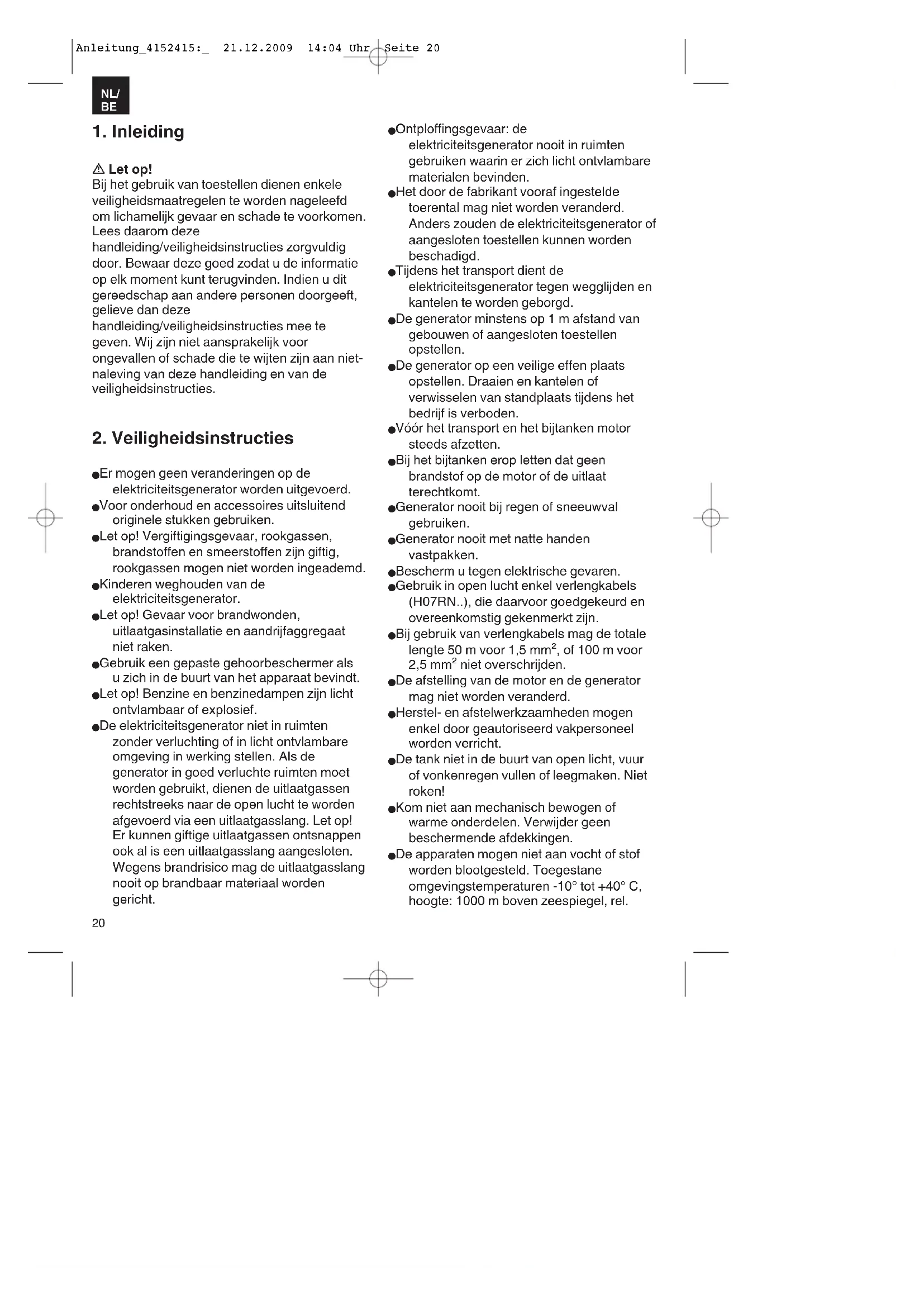 Anleitung_4152415:_ 21.12.2009 14:04 Uhr Seite 214. Reglementair gebruik Het toestel is geschikt voor toepassingen die op een wisselspanningsbron van 230 V draaien. Gelieve zeker de beperkingen vermeld in de veiligheidsinstructies in acht te nemen. De generator is bedoeld om elektrisch gereedschap aan te drijven en verlichtingsbronnen met stroom te voorzien. Gelieve bij huishoudapparaten na te gaan of ze geschikt zijn conform de informatie verstrekt door de fabrikant van het desbetreffende apparaat. Raadpleeg in geval van twijfel een geautoriseerde gespecialiseerde handelaar van het respectievelijke toestel. De machine mag slechts voor werkzaamheden worden gebruikt waarvoor ze bedoeld is. Elk ander verder gaand gebruik is niet reglementair. Voor daaruit voortvloeiende schade of letsel van welke aard dan ook is de gebruiker/bediener, niet de fabrikant, aansprakelijk. Wij wijzen erop dat onze toestellen overeenkomstig hun bestemming niet ontworpen zijn voor commercieel, ambachtelijk of industrieel gebruik. Wij zijn niet aansprakelijk indien het apparaat in ambachtelijke of industriële bedrijven alsmede bij gelijk te stellen activiteiten wordt gebruikt.
