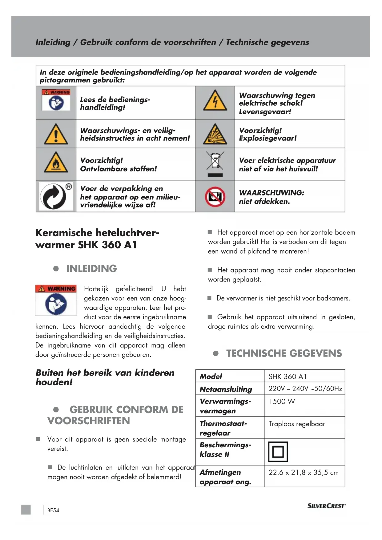 Voor dit apparaat is geen speciale montage vereist. De luchtinlaten en -uitlaten van het apparaat mogen nooit worden afgedekt of belemmerd! Het apparaat moet op een horizontale bodem worden gebruikt! Het is verboden om dit tegen een wand of plafond te monteren! Het apparaat mag nooit onder stopcontacten worden geplaatst. De verwarmer is niet geschikt voor badkamers. Gebruik het apparaat uitsluitend in gesloten, droge ruimtes als extra verwarming. TECHNISCHE GEGEVENS Model SHK 360 A1 Netaansluiting 220V – 240V ~50/60Hz Verwarmings- vermogen 1500 W Thermostaat- regelaar Traploos regelbaar Beschermings- klasse II Afmetingen apparaat ong. 22,6 x 21,8 x 35,5 cm Inleiding / Gebruik conform de voorschriften / Technische gegevens In deze originele bedieningshandleiding/op het apparaat worden de volgende pictogrammen gebruikt: Lees de bedienings- handleiding! Waarschuwing tegen elektrische schok! Levensgevaar! Waarschuwings- en veilig- heidsinstructies in acht nemen! Voorzichtig! Explosiegevaar! Voorzichtig! Ontvlambare stoffen! Voer elektrische apparatuur niet af via het huisvuil! Voer de verpakking en het apparaat op een milieu- vriendelijke wijze af! WAARSCHUWING: niet afdekken.BE 55 Inhoudsopgave LEVERINGSOMVANG Controleer altijd onmiddellijk na het uitpakken of het apparaat in perfecte staat is. Gebruik het product niet als dit defect is. Heteluchtblazer Originele bedieningshandleiding Aan-/uitknop (I betekent AAN / O betekent UIT) Stand-by(functie)controlelampje Ventilatorcontrolelampje Controlelampje voor stand 1 Controlelampje voor stand 2 Stand-byschakelaar Ventilatorschakelaar Toets voor stand 1 Toets voor stand 2 Thermostaatdraaischakelaar Draaggreep Stroomstekker Symbolen: Stand-bysymbool Ventilatorsymbool Symbool verwarmingsstand 1 (750 W) Symbool verwarmingsstand 2 (1500 W) VOOR DE INBEDRIJFSTELLING Open de verpakking en neem het apparaat voorzichtig uit de verpakking. Verwijder het verpakkingsmateriaal en ver- pakkings-/ en transportbeveiligingen (indien aanwezig). Controleer of de omvang van de levering volle- dig is. Controleer het apparaat en de accessoireon- derdelen op transportschade. Bewaar de verpakking en documenten indien mogelijk totdat de garantieperiode verstreken is. Lees deze handleiding aandachtig door voor- dat u het apparaat gebruikt en bewaar ze om later te raadplegen. Wanneer het apparaat door een nieuwe eigenaar wordt gekocht, moet de bedieningshandleiding bij het appa- raat worden gevoegd. Dit apparaat mag uitsluitend met zijn hoofd- functie worden gebruikt, waarvoor het werd ontworpen, bijv. het verwarmen van woningen. Elk afwijkend gebruik wordt beschouwd als incorrect en dus als gevaarlijk. De fabrikant is niet aansprakelijk voor fouten/defecten die door incorrect of niet-reglementair gebruik wor- den veroorzaakt. Door het niet naleven van de veiligheidsinstructies vervalt de garantie. Gebruik dit verwarmingsapparaat niet in de onmiddellijke omgeving van een bad, een douche of naast een zwembad. Het apparaat mag uitsluitend in rechtopstaan- de positie op een stabiel vlak worden gebruikt. Het gebruik op een onstabiel vlak (bijv. bed) is niet toegestaan. ATTENTION