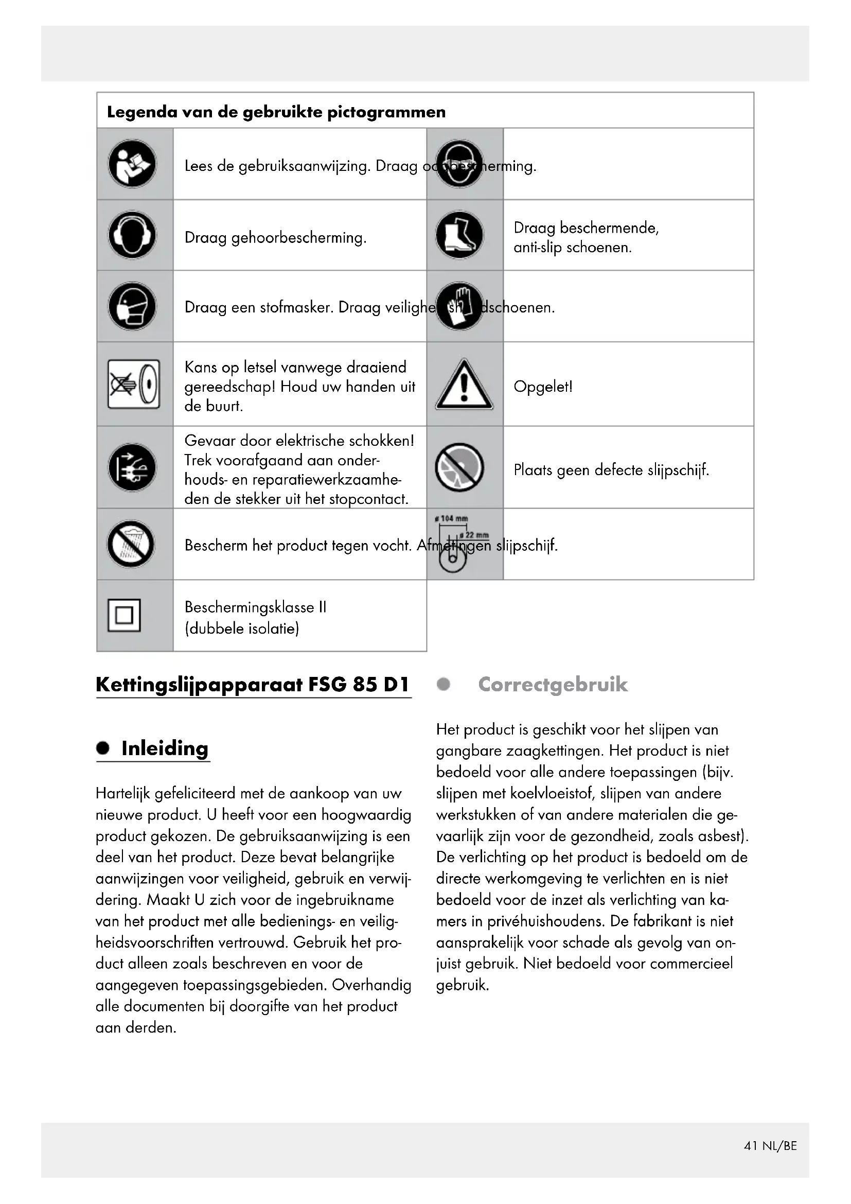 door een vakman repareren Dit elektrische gereedschap voldoet aan de uniforme veiligheidsbepalingen. Reparaties mogen alleen door een vakman en met gebruik van originele reserveonderdelen worden uitgevoerd, anders is er kans op ongevallen bij de gebruiker. De volgende restrisico‘s blijven ondanks geno- men maatregelen om het design zeer veilig vorm te geven, en ondanks veiligheids- en aan- vullende beschermende maatregelen, bestaan:45 NL/BE de slijpschijf loopt na, nadat het werktuig is uit- geschakeld. Er is kans op letsel. Verdere veiligheidsinstructies Sluit het product alleen aan op een stop- contact met een aardlekschakelaar met een vastgestelde lekstroom van niet meer dan 30 mA. Houd stroomkabels en verlengsnoeren bij de slijpschijf en de zaagketting vandaan. Trek bij beschadiging of doorsnijden direct de stekker uit het stopcontact. Raak de ka- bel niet aan, voordat deze van het stroom- net is gescheiden. Gevaar door elektrische schokken! Voer voorafgaand aan het gebruik een zichtcontrole van de slijpschijf uit. Gebruik geen slijpschijven met barsten, scheuren of andere beschadigingen. Vervang een versleten slijpschijf. Gebruik het product nooit zonder veilig- heidsglas. Werk niet met het product als u moe bent of na de inname van alcohol of tabletten. Pauzeer altijd op tijd. Gebruik het product niet in een explosieve omgeving of op plaatsen waar het vonken, vuur, explosies etc. zou kunnen veroorzaken. Bij het negeren bestaat brand- of explosie- gevaar. Zorg dat de ventilatieopeningen bij stoffige werkzaamheden vrij zijn. Houd uw handen uit de buurt van de slijp- schijf en de tanden van de ketting, als het product in bedrijf is. Beweeg de zaagketting niet met uw handen. Er is kans op letsel. Houd uw vingers nooit tussen de slijpschijf en de draaitafel of tussen de slijpschijf en de beschermende schijf. Er bestaat beknel- lingsgevaar. De zaagketting wordt tijdens het slijpen warm. Niet op de bewerkte plek aanraken, er is kans op brandwonden. Gebruik alleen door de fabrikant aangera- den slijpschijven. Gebruik geen zaagbladen. Schakel het product uit en trek de stekker uit het stopcontact - om een geblokkeerd werktuig los te maken, - als de stroomkabel beschadigd of verward is geraakt, - bij ongebruikelijke geluiden. Voor de ingebruikname Opmerking: verwijder het verpakkingsmateri- aal alstublieft volledig. De bediener moet zich tijdens het gebruik dicht bij het product bevinden om onnodig rekken van het lichaam en een daarmee instabiele positie te vermijden. Montage Opmerking: bevestig het product altijd met de meegeleverde schroeven (M10 x 60). Zorg voor voldoende ruimte om te werken en zorg ervoor dat andere personen tijdens de werkzaamheden niet in gevaar worden gebracht. Bevestig het product altijd op het werkblad met behulp van schroeven die lang en dik genoeg zijn, om de controle over het product niet kwijt te raken. Product plaatsen (zie afb. B) - dikte van de te gebruiken tafelrand: 15–30 mm - diameter boor: 10,5 mm - afmetingen schroeven: M10 Positioneer het product met behulp van de aanslagkerven