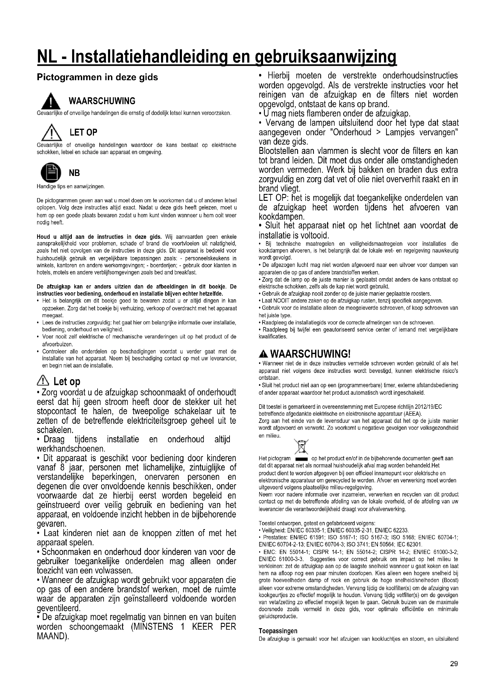 Handige tips en aanwijzingen. De pictogrammen geven aan wat u moet doen om te voorkomen dat u of anderen letsel oplopen. Volg deze instructies altijd exact. Nadat u deze gids heeft gelezen, moet u hem op een goede plaats bewaren zodat u hem kunt vinden wanneer u hem ooit weer nodig heeft. Houd u altijd aan de instructies in deze gids. Wij aanvaarden geen enkele aansprakelijkheid voor problemen, schade of brand die voortvloeien uit nalatigheid, zoals het niet opvolgen van de instructies in deze gids. Dit apparaat is bedoeld voor huishoudelijk gebruik en vergelijkbare toepassingen zoals: - personeelskeukens in winkels, kantoren en andere werkomgevingen; - boerderijen; - gebruik door klanten in hotels, motels en andere verblijfsomgevingen zoals bed and breakfast. De afzuigkap kan er anders uitzien dan de afbeeldingen in dit boekje. De instructies voor bediening, onderhoud en installatie blijven echter hetzelfde.