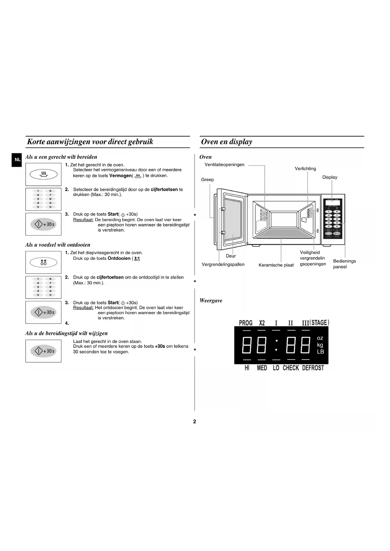 Korte aanwijzingen voor direct gebruik Als u een gerecht wilt bereiden Als u voedsel wilt ontdooien Als u de bereidingstijd wilt wijzigen Oven en display Oven Weergave