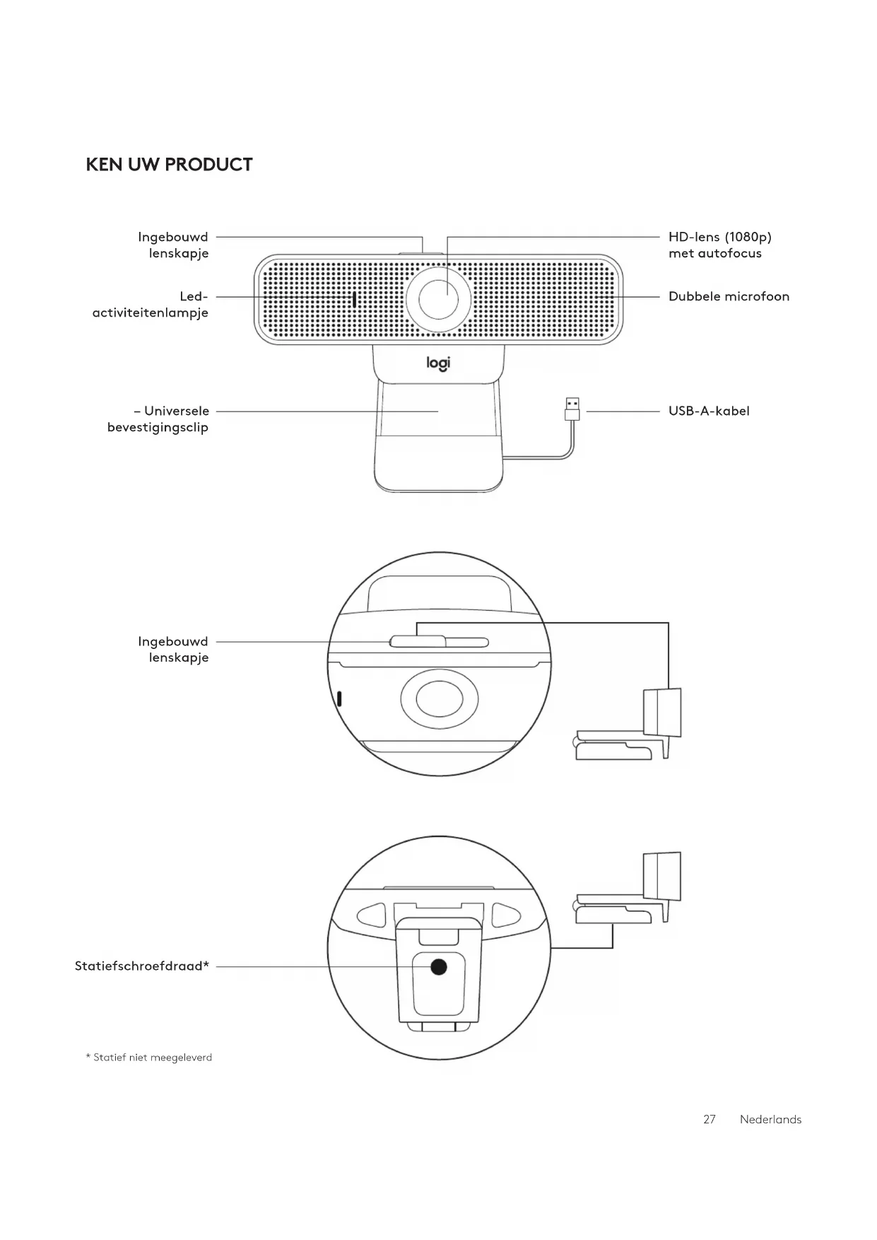 1 Webcam met aangesloten USB-A-kabel van 1,83 m (6ft) 2 Handleiding