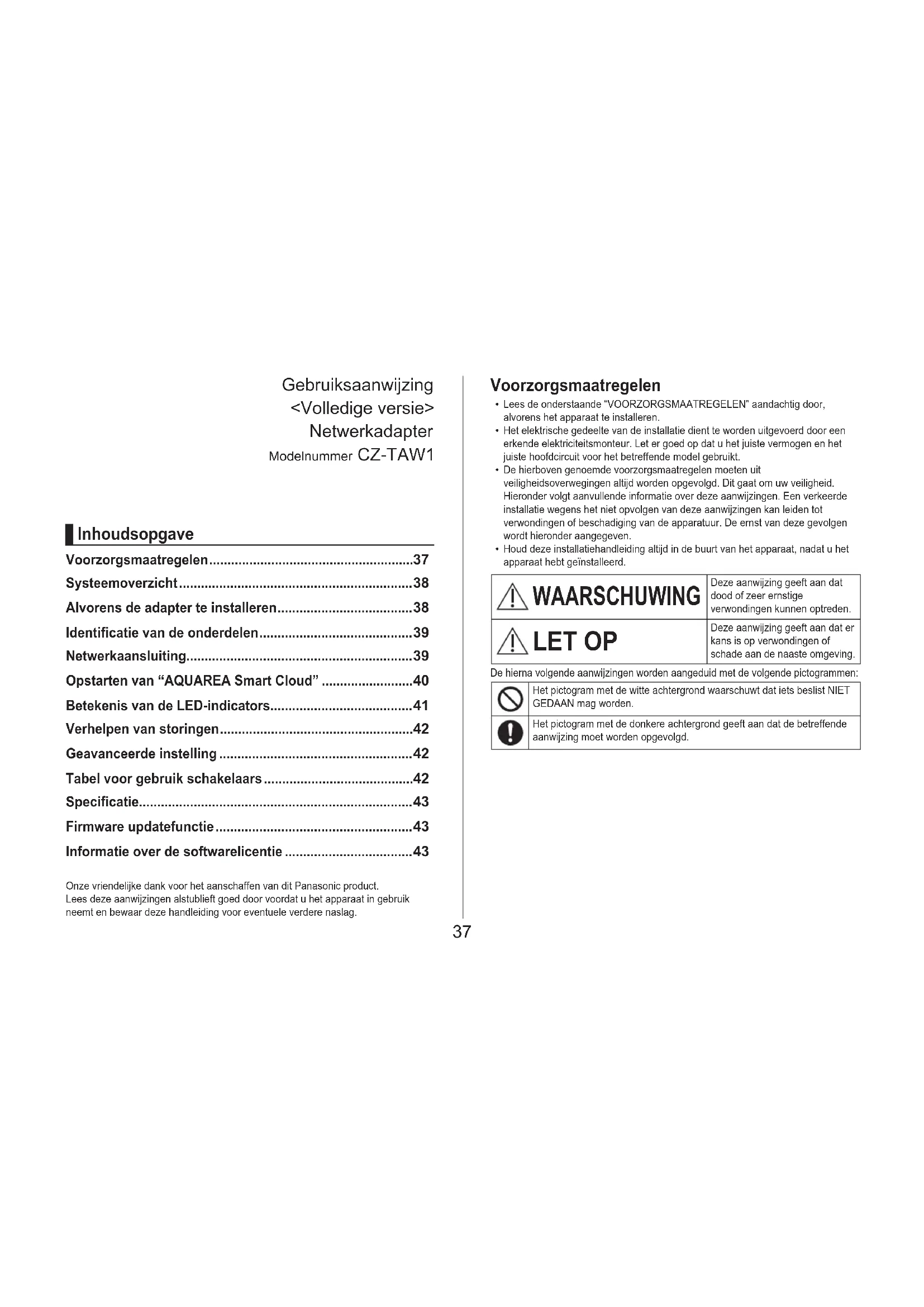 Gebruiksaanwijzing <Volledige versie> Netwerkadapter Modelnummer CZ‑TAW1 Onze vriendelijke dank voor het aanschaffen van dit Panasonic product. Lees deze aanwijzingen alstublieft goed door voordat u het apparaat in gebruik neemt en bewaar deze handleiding voor eventuele verdere naslag.38 WAARSCHUWING