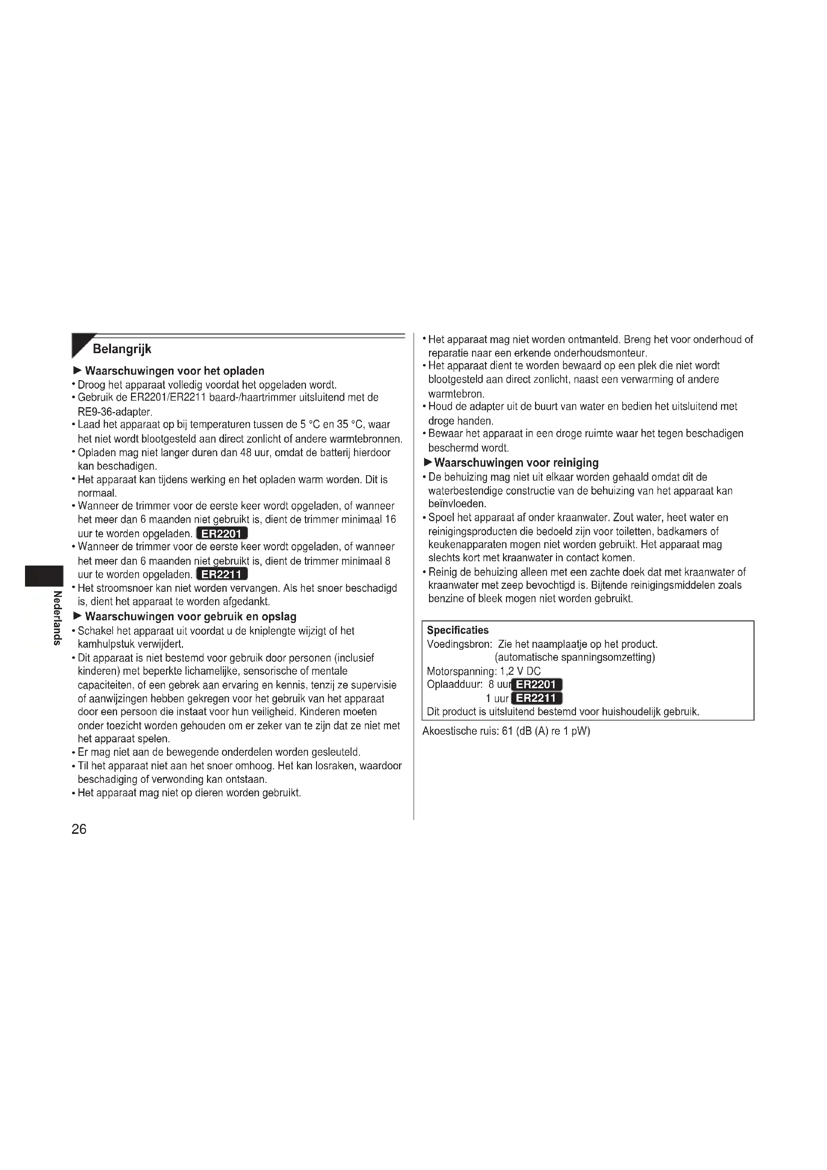Het apparaat mag niet worden ontmanteld. Breng het voor onderhoud of reparatie naar een erkende onderhoudsmonteur. Het apparaat dient te worden bewaard op een plek die niet wordt blootgesteld aan direct zonlicht, naast een verwarming of andere warmtebron. Houd de adapter uit de buurt van water en bedien het uitsluitend met droge handen. Bewaar het apparaat in een droge ruimte waar het tegen beschadigen beschermd wordt. Waarschuwingen voor reiniging De behuizing mag niet uit elkaar worden gehaald omdat dit de waterbestendige constructie van de behuizing van het apparaat kan beïnvloeden. Spoel het apparaat af onder kraanwater. Zout water, heet water en reinigingsproducten die bedoeld zijn voor toiletten, badkamers of keukenapparaten mogen niet worden gebruikt. Het apparaat mag slechts kort met kraanwater in contact komen. Reinig de behuizing alleen met een zachte doek dat met kraanwater of kraanwater met zeep bevochtigd is. Bijtende reinigingsmiddelen zoals benzine of bleek mogen niet worden gebruikt. Specicaties Voedingsbron: Zie het naamplaatje op het product. (automatische spanningsomzetting) Motorspanning: 1,2 V DC Oplaadduur: 8 uur ER2201 1 uur ER2211 Dit product is uitsluitend bestemd voor huishoudelijk gebruik. Akoestische ruis: 61 (dB (A) re 1 pW)