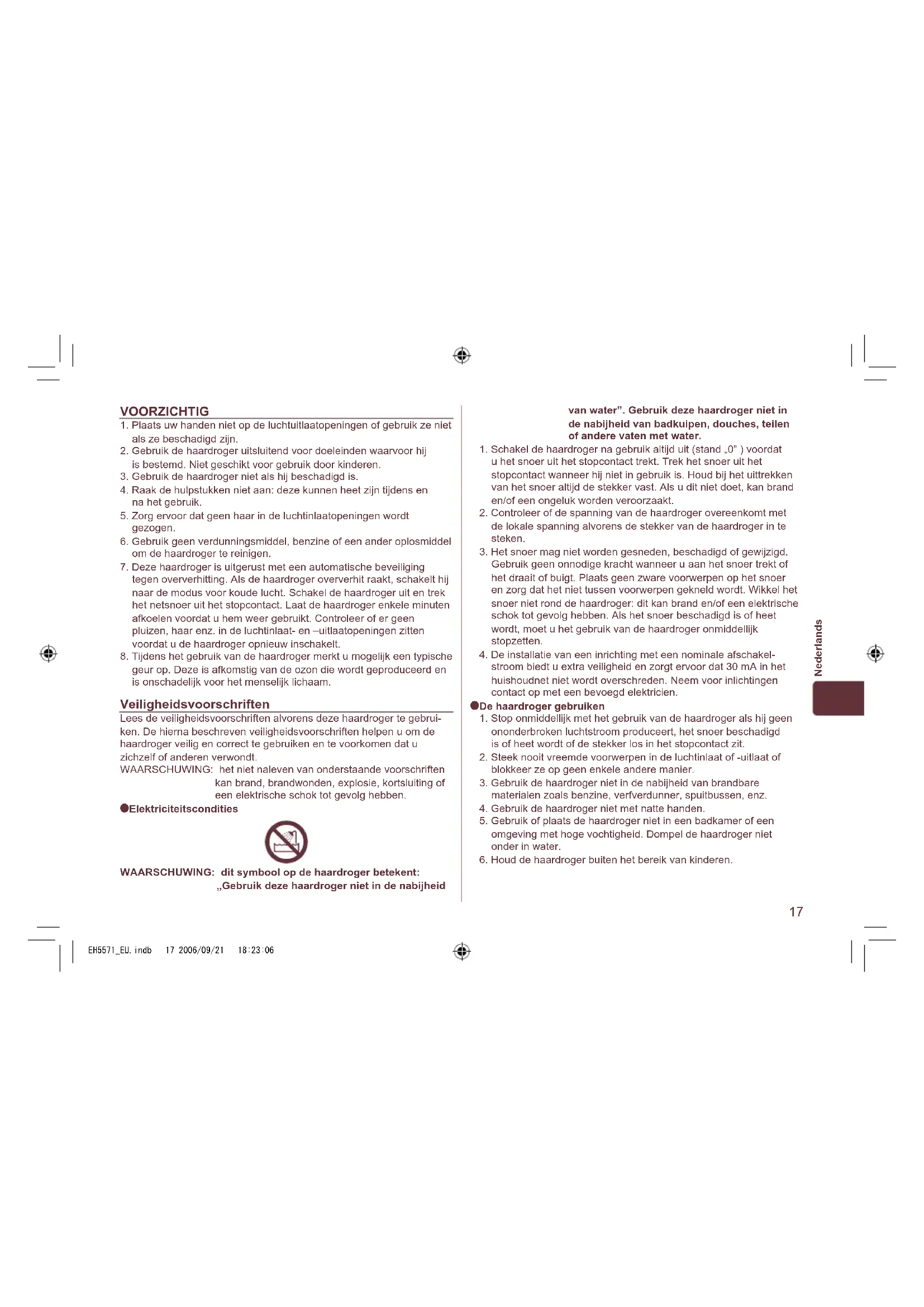 Elektriciteitscondities WAARSCHUWING: dit symbool op de haardroger betekent: „Gebruik deze haardroger niet in de nabijheid van water”. Gebruik deze haardroger niet in de nabijheid van badkuipen, douches, teilen of andere vaten met water.