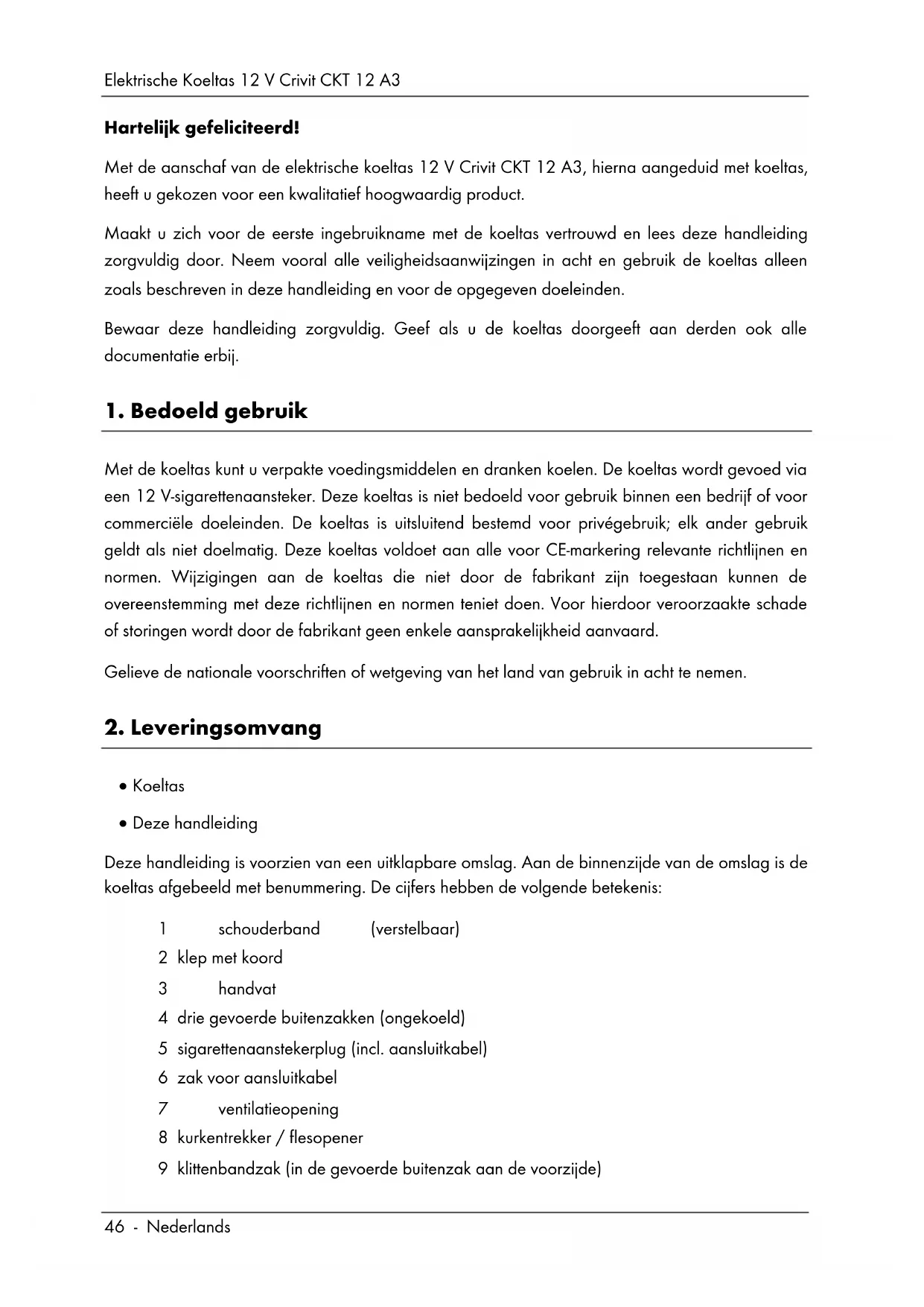 Koeltas Deze handleiding Deze handleiding is voorzien van een uitklapbare omslag. Aan de binnenzijde van de omslag is de koeltas afgebeeld met benummering. De cijfers hebben de volgende betekenis: 1 schouderband (verstelbaar) 2 klep met koord 3 handvat 4 drie gevoerde buitenzakken (ongekoeld) 5 sigarettenaanstekerplug (incl. aansluitkabel) 6 zak voor aansluitkabel 7 ventilatieopening 8 kurkentrekker / flesopener 9 klittenbandzak (in de gevoerde buitenzak aan de voorzijde)Elektrische Koeltas 12 V Crivit CKT 12 A3 Nederlands - 47