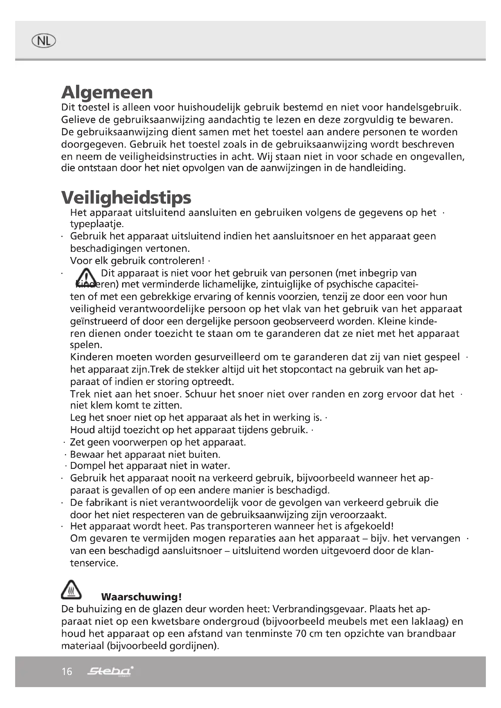 Ici, c‘est le fromage qui est la vedette de la soirée Raclette. Prévoyez environ 200 - 250g de fromage et de pommes de terre par personne et les accompagnements de votre choix. Mettez une tranche de fromage coupée comme il convient, ayant une épaisseur d‘un demi centimetre, dans le poÍlon et placez-le sous le grill. Quand le fro- mage a fondu de faÁon crémeuse, retirez le fromage l‘aide d‘une spatule en bois et servez-le par exemple avec des pommes de terre en robe de chambre ou en papillote, des morceaux de baguette ou du pain de mie grillé. Nettoyage Avant de nettoyer l‘appareil, retirez toujours la fiche de la prise de courant. ∙ Nettoyez l‘appareil le plus tut possible apres son utilisation, mais laissez refroidir ∙ suffisamment la surface de cuisson. L‘appareil se nettoie plus facilement tant qu‘il est encore un peu chaud. Pour retirer la surface de cuisson, soulevez-la légere ment par le bas avec une main. Vous pouvez alors l‘enlever sans problËme. Appareil de base: Pour son nettoyage, utilisez un chiffon humide. Ne trempez jamais l‘appareil dans l‘eau. Veillez également ce que de l‘eau ne coule pas dans l‘appareil. Tenez également compte des indications concernant la sécurité. PoÍlons Gourmet: Faites tremper si nécessaire les poÍlons Gourmet quelque temps dans de l‘eau laquelle vous aurez ajouté quelques gouttes de liquide vaisselle. Plaque antiadhesive du grill: Vous pouvez nettoyer la plaque du grill égale ment dans un bain d‘eau chaude additi- onnée de liquide vaisselle, mais elle résiste aussi au lave-vaisselle. 480-13220 - RC28 - 06-2011.indd 14 01.07.2011 14:57:0615 Evacuation correcte de ce produit: Rendre les appareils ayant fait leur temps immédiatement inutilisables Au sein de l’EU, ce symbole indique que ce produit ne doit pas être évacué avec les déchets mécaniques. Les vieux appareils contiennent des matériaux qui peuvent être recyclés et qui devraient être déposés à des centres de récupération et afin de ne pas altérer l’environnement, voire la santé des personnes par une élimintation des déchets non- contrôlée. Veuillez donc évacuer les appareils usés par des systèmes de collecte bien appropriés ou envoyez-lea opoù vous l’avez acheté en vue d’évacuation. L’appareil sera alors amené à la récupération des matériaux. Service Après-Vente: Si contre toute attente, votre appareil devait avoir besoin du SAV, veuillez alors vous adresser à l’adresse suivante. Nous en organiserons alors d’enlèvement. Des paquets non affranchis ne pourront pas être pris en charge. STEBA Elektrogeräte GmbH & Co KG Pointstr. 2, 96129 Strullendorf / Germany Distribution-Tél.: 09543 / 449-17 / -18, Service-Tél.: 09543 / 449-44, Fax: 09543 / 449-19 e-Mail: elektro@steba.com Internet: http://www.steba.com Attention! Les appareils électriques ne seront réparés que par du personnel élec- tricien qualifié étant donné que des réparations non-conformes peuvent avoir des conséquences graves. 480-13220 - RC28 - 06-2011.indd 15 01.07.2011 14:57:0716 Algemeen Dit toestel is alleen voor huishoudelijk gebruik bestemd en niet voor handelsgebruik. Gelieve de gebruiksaanwijzing aandachtig te lezen en deze zorgvuldig te bewaren. De gebruiksaanwijzing dient samen met het toestel aan andere personen te worden doorgegeven. Gebruik het toestel zoals in de gebruiksaanwijzing wordt beschreven en neem de veiligheidsinstructies in acht. Wij staan niet in voor schade en ongevallen, die ontstaan door het niet opvolgen van de aanwijzingen in de handleiding. Veiligheidstips Het apparaat uitsluitend aansluiten en gebruiken volgens de gegevens op het ∙ typeplaatje. Gebruik het apparaat uitsluitend indien het aansluitsnoer en het apparaat geen ∙ beschadigingen vertonen. Voor elk gebruik controleren! ∙ ∙ Dit apparaat is niet voor het gebruik van personen (met inbegrip van kinderen) met verminderde lichamelijke, zintuiglijke of psychische capacitei- ten of met een gebrekkige ervaring of kennis voorzien, tenzij ze door een voor hun veiligheid verantwoordelijke persoon op het vlak van het gebruik van het apparaat geïnstrueerd of door een dergelijke persoon geobserveerd worden. Kleine kinde- ren dienen onder toezicht te staan om te garanderen dat ze niet met het apparaat spelen. Kinderen moeten worden gesurveilleerd om te garanderen dat zij van niet gespeel ∙ het apparaat zijn.Trek de stekker altijd uit het stopcontact na gebruik van het ap- paraat of indien er storing optreedt. Trek niet aan het snoer. Schuur het snoer niet over randen en zorg ervoor dat het ∙ niet klem komt te zitten. Leg het snoer niet op het apparaat als het in werking is. ∙ Houd altijd toezicht op het apparaat tijdens gebruik. ∙ Zet geen voorwerpen op het apparaat. ∙ Bewaar het apparaat niet buiten. ∙ Dompel het apparaat niet in water. ∙ Gebruik het apparaat nooit na verkeerd gebruik, bijvoorbeeld wanneer het ap- ∙ paraat is gevallen of op een andere manier is beschadigd. De fabrikant is niet verantwoordelijk voor de gevolgen van verkeerd gebruik die ∙ door het niet respecteren van de gebruiksaanwijzing zijn veroorzaakt. Het apparaat wordt heet. Pas transporteren wanneer het is afgekoeld! ∙ Om gevaren te vermijden mogen reparaties aan het apparaat – bijv. het vervangen ∙ van een beschadigd aansluitsnoer – uitsluitend worden uitgevoerd door de klan- tenservice. Waarschuwing! De buhuizing en de glazen deur worden heet: Verbrandingsgevaar. Plaats het ap- paraat niet op een kwetsbare ondergroud (bijvoorbeeld meubels met een laklaag) en houd het apparaat op een afstand van tenminste 70 cm ten opzichte van brandbaar materiaal (bijvoorbeeld gordijnen). 480-13220 - RC28 - 06-2011.indd 16 01.07.2011 14:57:0817