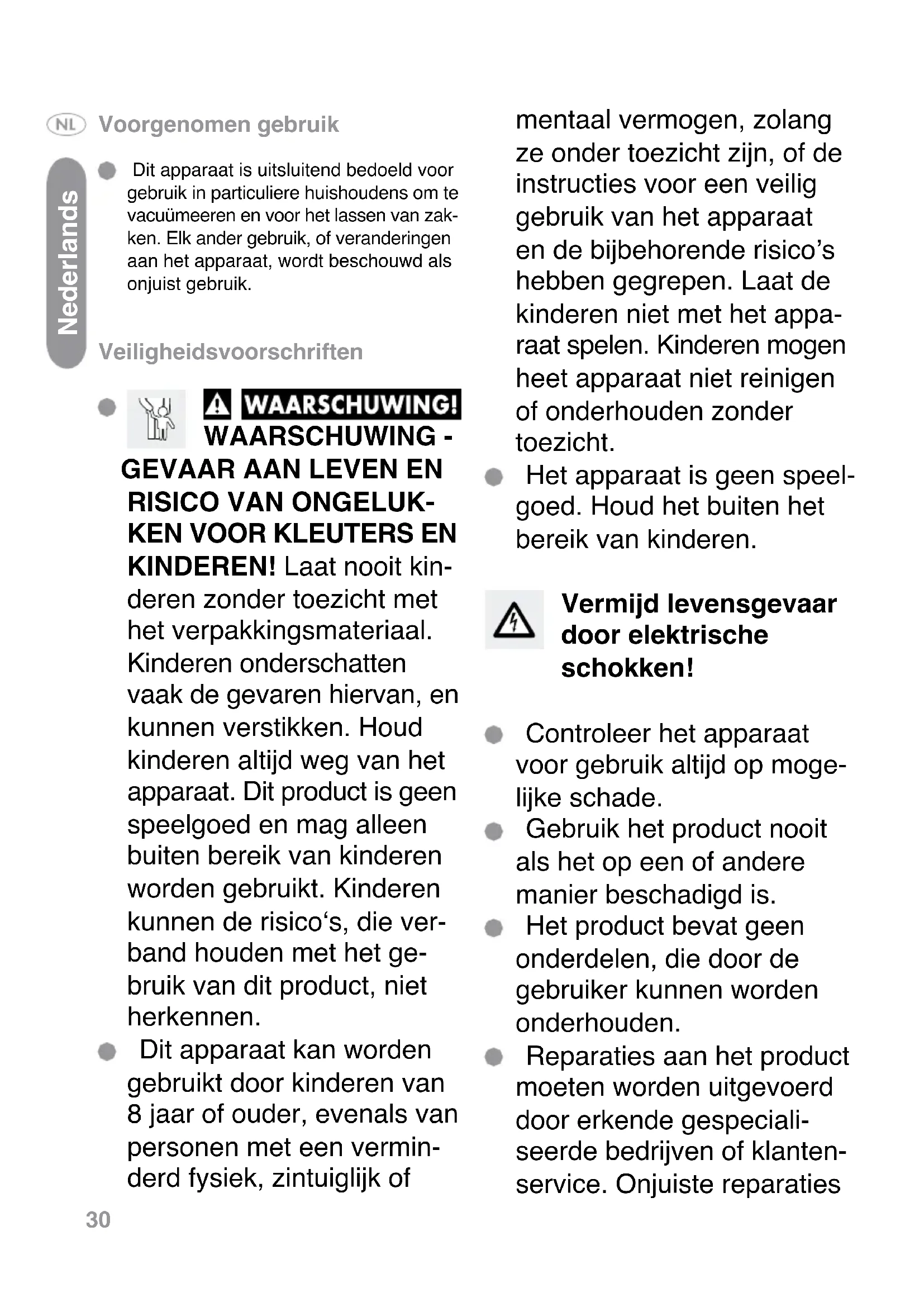 - Dit apparaat is uitsluitend bedoeld voor gebruik in particuliere huishoudens om te vacuumeeren en voor het{lassen van zakken. Elk ander gebruik, of veranderingen aan het apparaat, wordt beschouwd als onjuist gebruik.