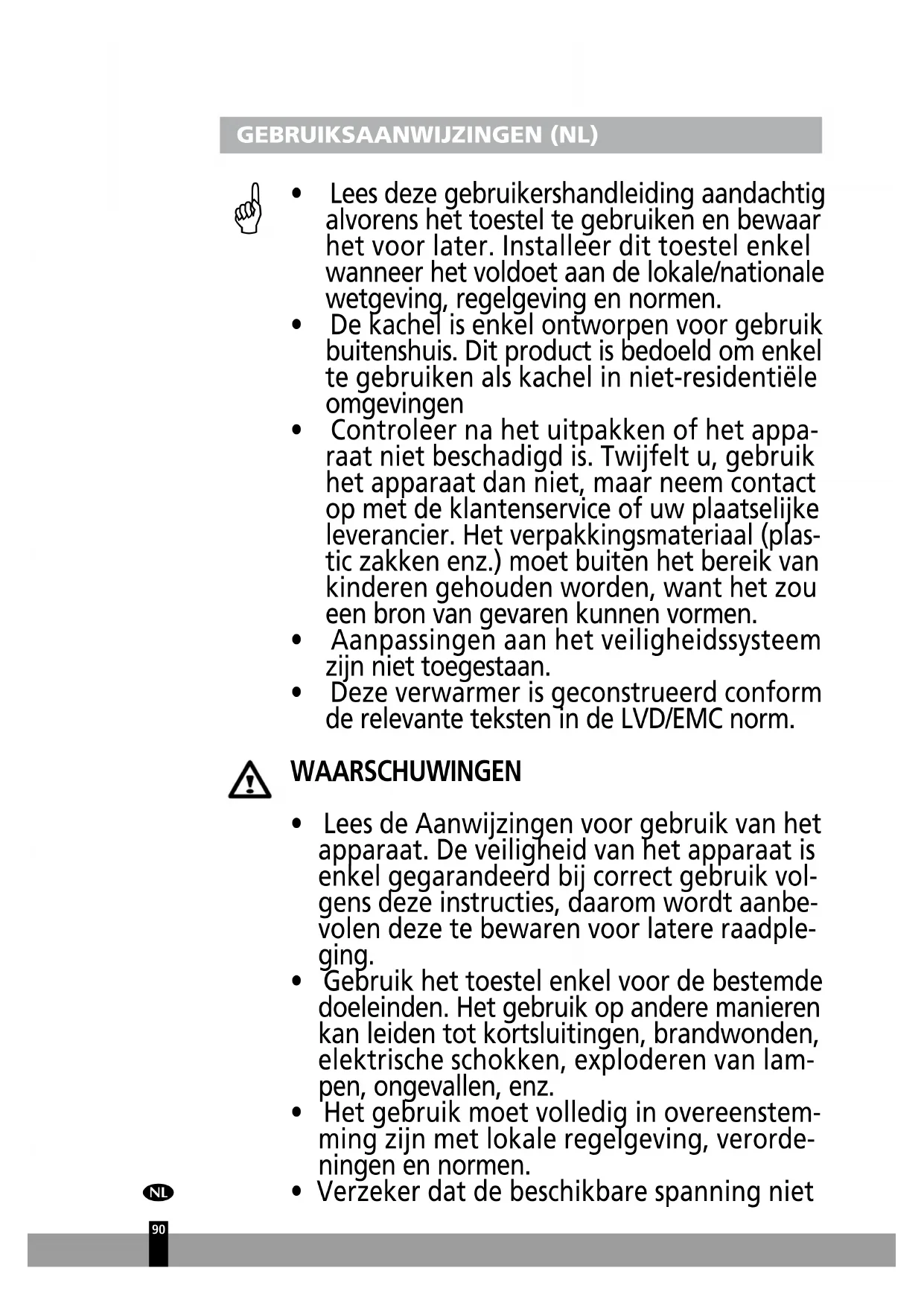 - Deze verwarmer is geconstrueerd conform de relevante teksten in de LVD/EMC norm. WAARSCHUWINGEN